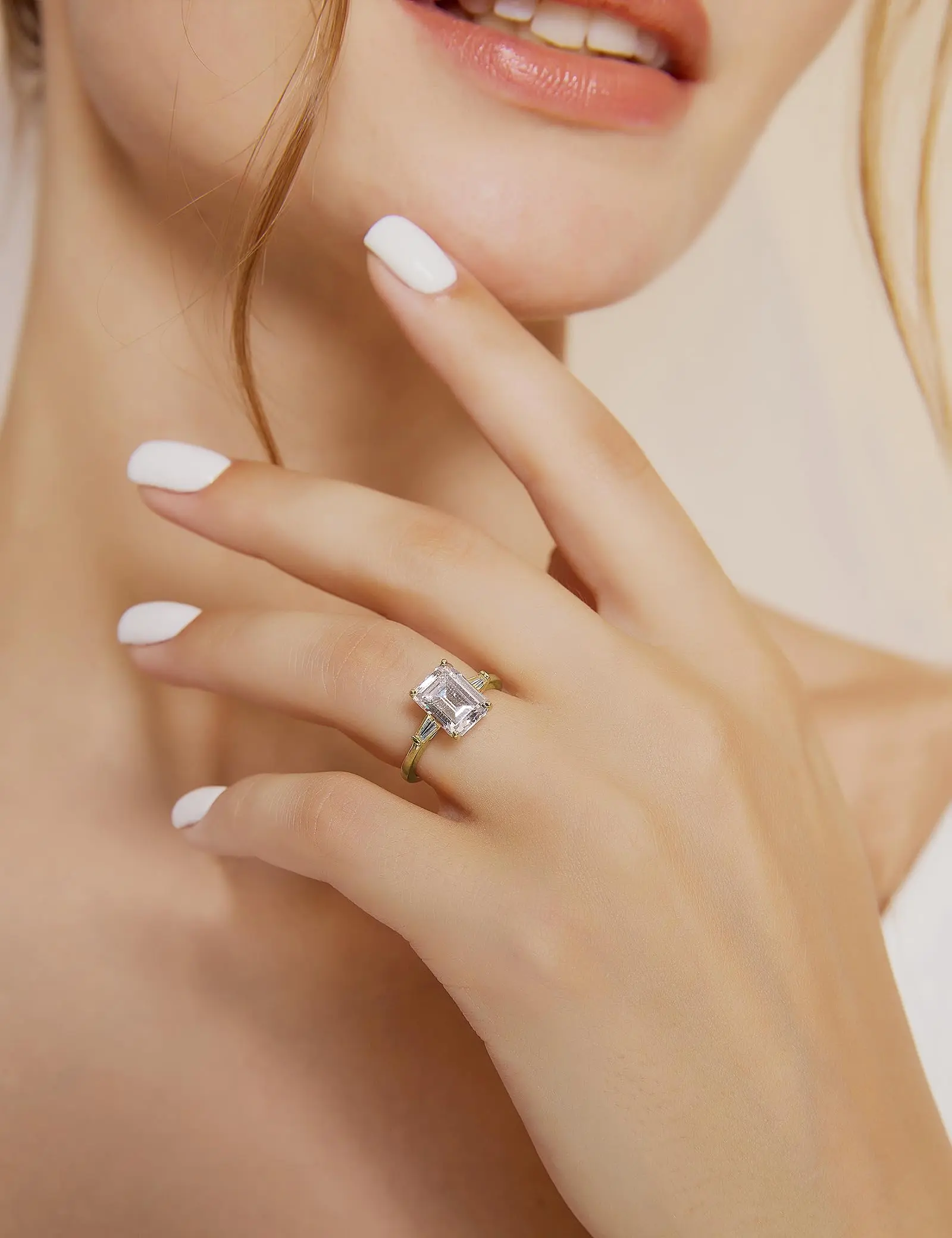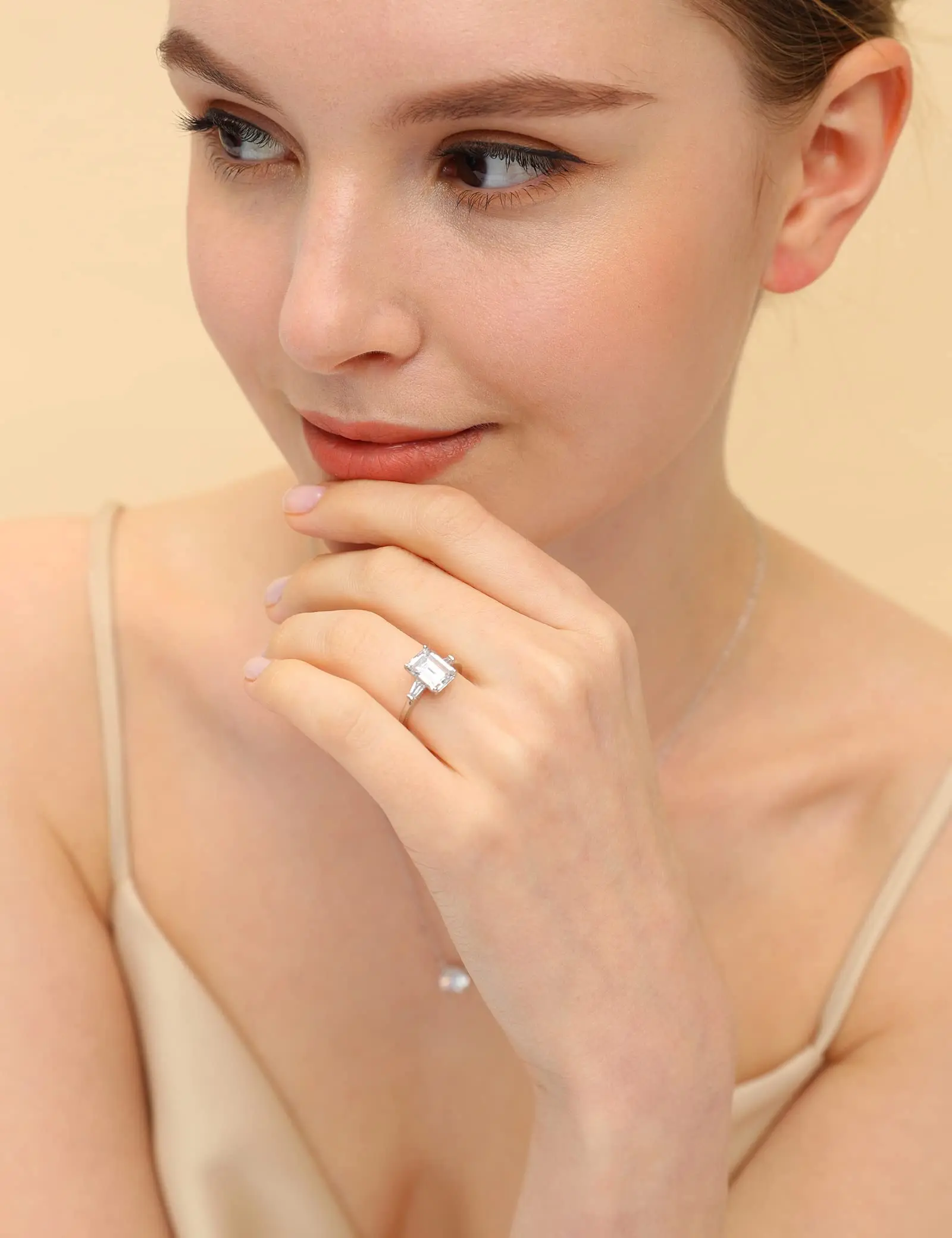 ·♥ Stylish ♥ Captivating two trapezoid-shaped stones brilliantly frame the center Cubic Zirconia in this classic three stone ring. The petite band gently tapers and secures Cubic Zirconia in a basket setting