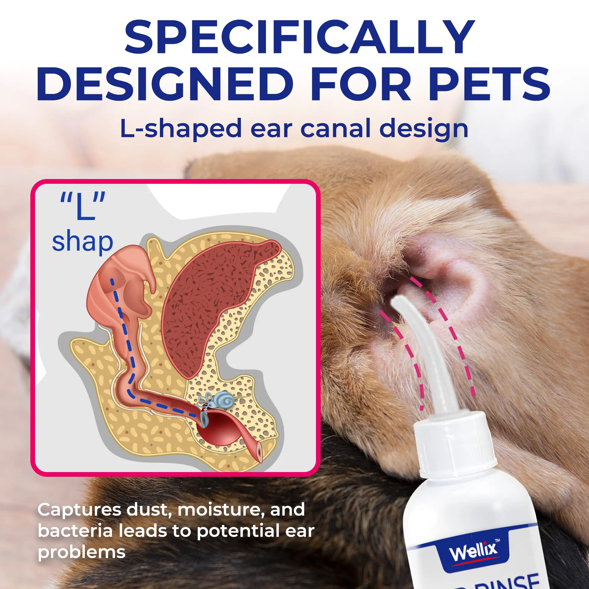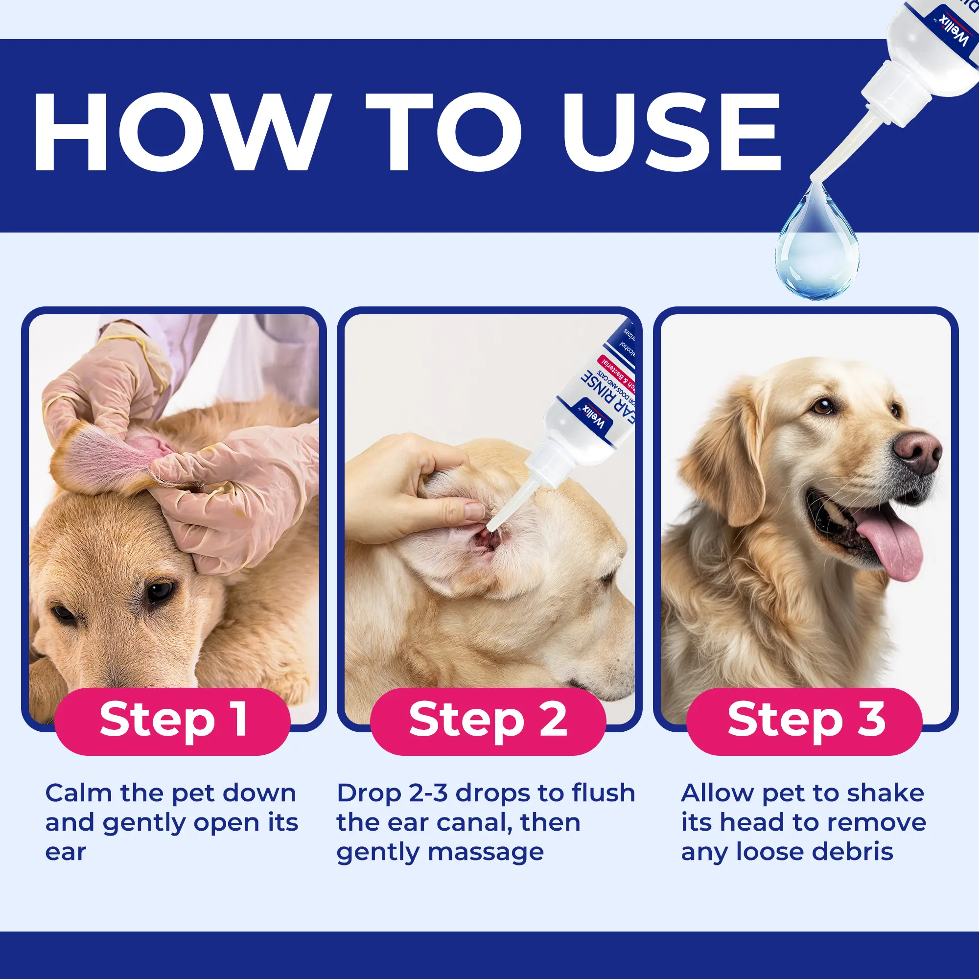 This product is very effective, easy to use with the flexible top and the even flow of the liquid; after we play ring-around-the-rosy just to get it in my dog ears.