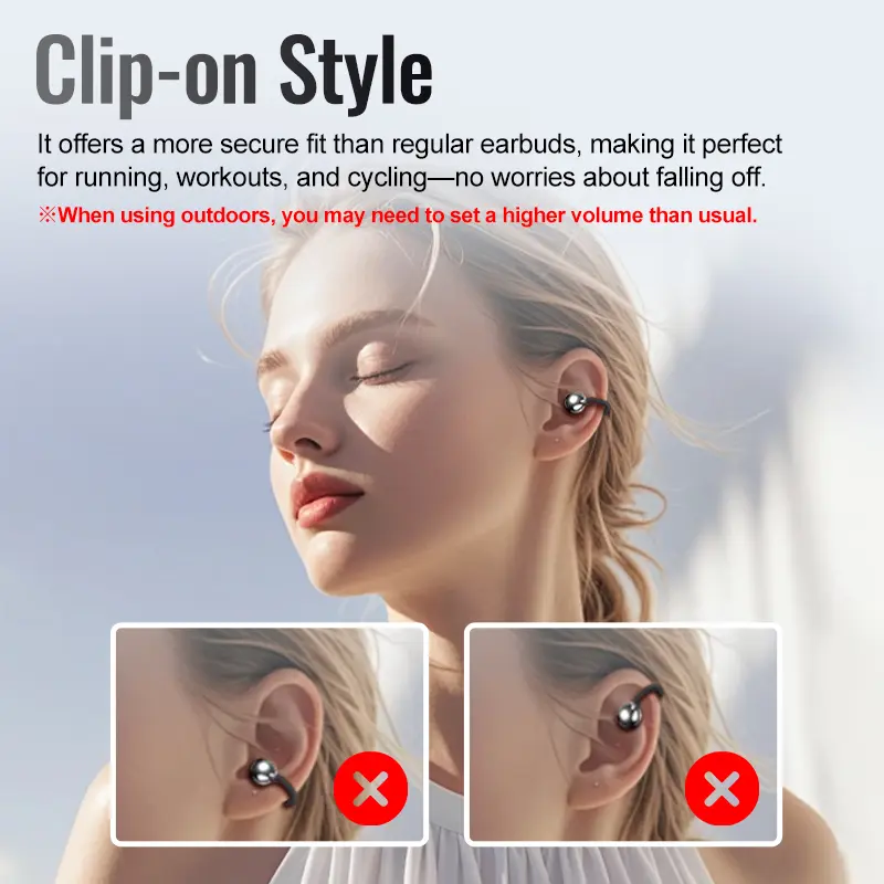 Ever struggled with earbuds that slip out during your run or workout? Meet the HYUNDAI C02 Clip On Ear Headphones. These wireless headphones feature a clip-on design that stays put no matter how intense your activity is. The full color LCD touch screen lets you control music and calls with a simple tap, while Bluetooth 5.4 ensures crisp, lossless audio streaming. With adaptive noise reduction, your voice calls come through crystal clear, even in noisy environments. The 10mm dynamic speaker pumps out rich Hi-Fi sound, making your playlists sound amazing. Plus, enjoy up to 4 hours of playtime and a whopping 8 months of standby on a quick 1-hour charge. Whether you're running, cycling, or just chilling, the comfortable ear clip fits various ear shapes for all-day wear. Inside the box, you get the headphones with smart gesture controls, volume adjustment, and automatic reconnection when you open the headset cover. Ready to upgrade your workout soundtrack? Grab your HYUNDAI C02 headphones and experience wireless freedom with style and comfort.