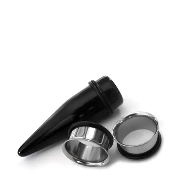 1 acrylic black taper. 1 pair of stainless steel tunnels. Single flares