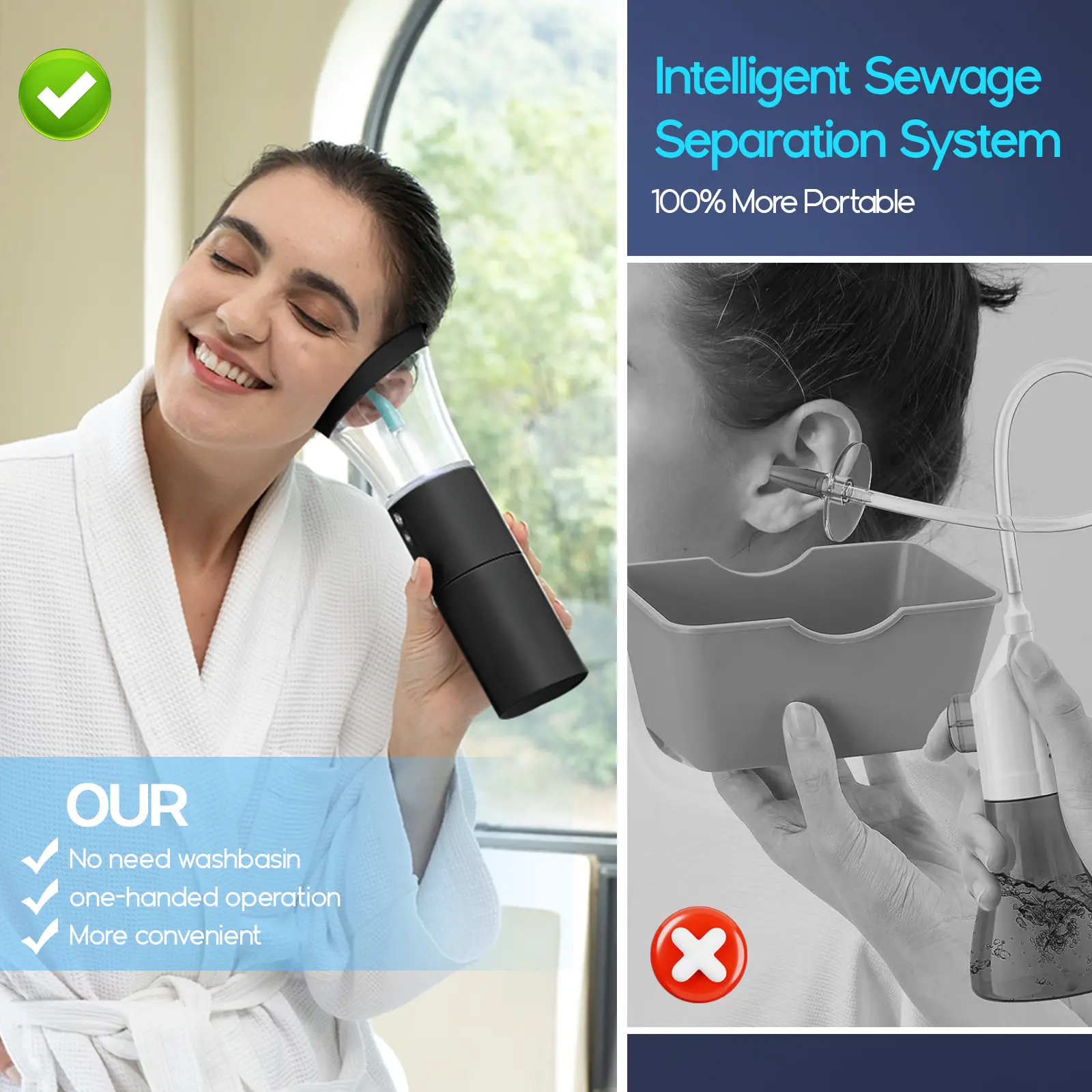 2. Convenient and Hygienic Design: Our latest model features separate compartments for clean water and waste, eliminating the need for hand-held tools to connect to sewage. With integrated sewage treatment and single-hand operation, it's easy to use anywhere.