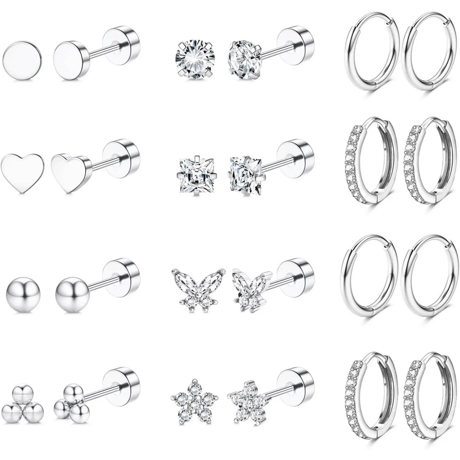 ·Earrings Sets for Multiple Piercing: Including 8 pairs gold flat back stud earrings and 4 pairs hoop earrings. Stud and hoop earrings set for multiple piercings, such as cartilage earring, helix piercing, first hole, second hole, third hole, tragus piercing, etc. Feel free to match your style!