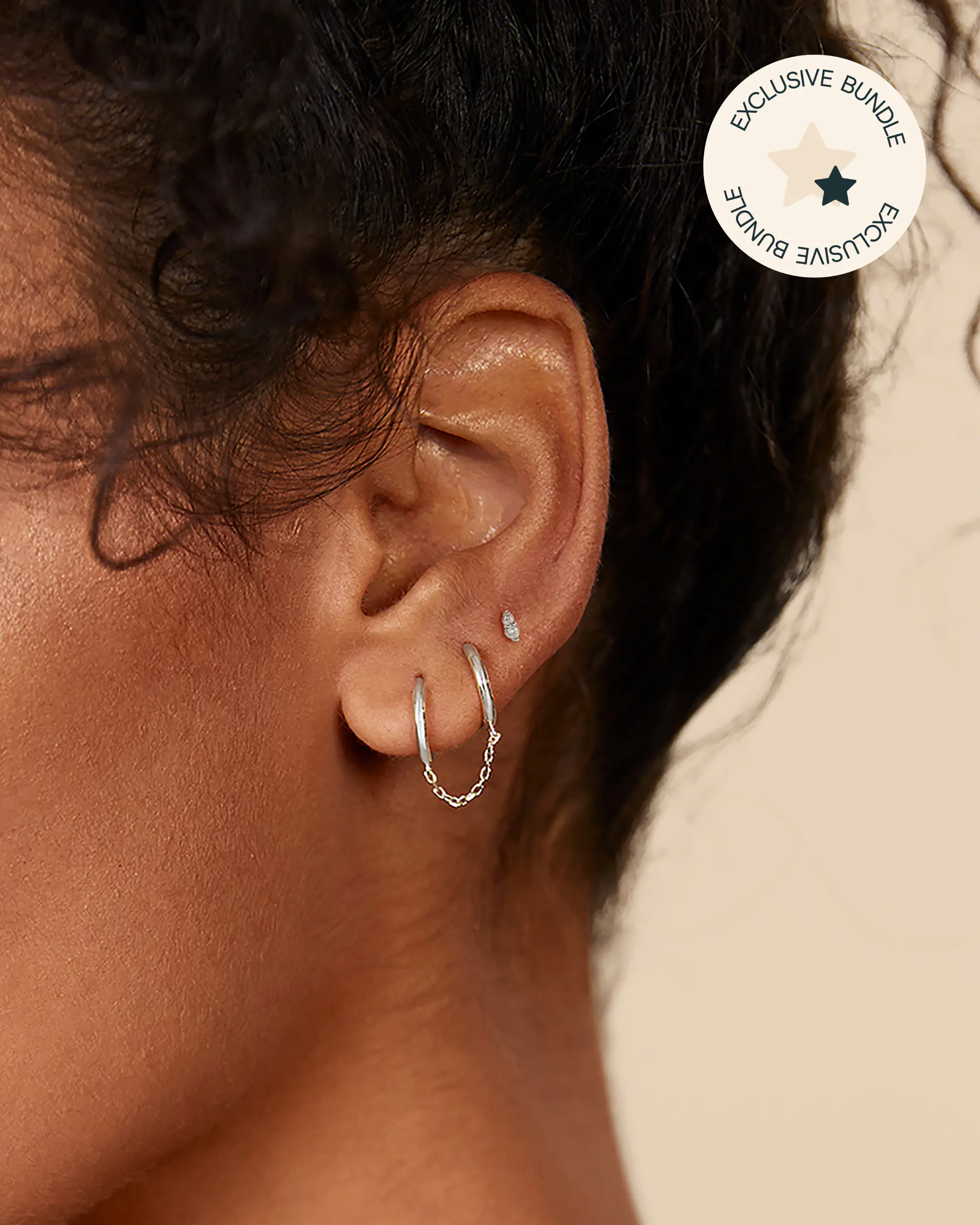 Experience the perfect blend of boldness and elegance with our earring pack. This exclusive set includes the double piercing dangle chain huggies and the small crystal flatback studs, perfect for making a statement. Ideal for any occasion, whether worn solo or as part of an earring stack.