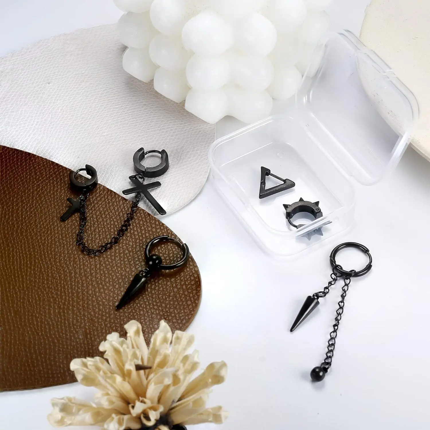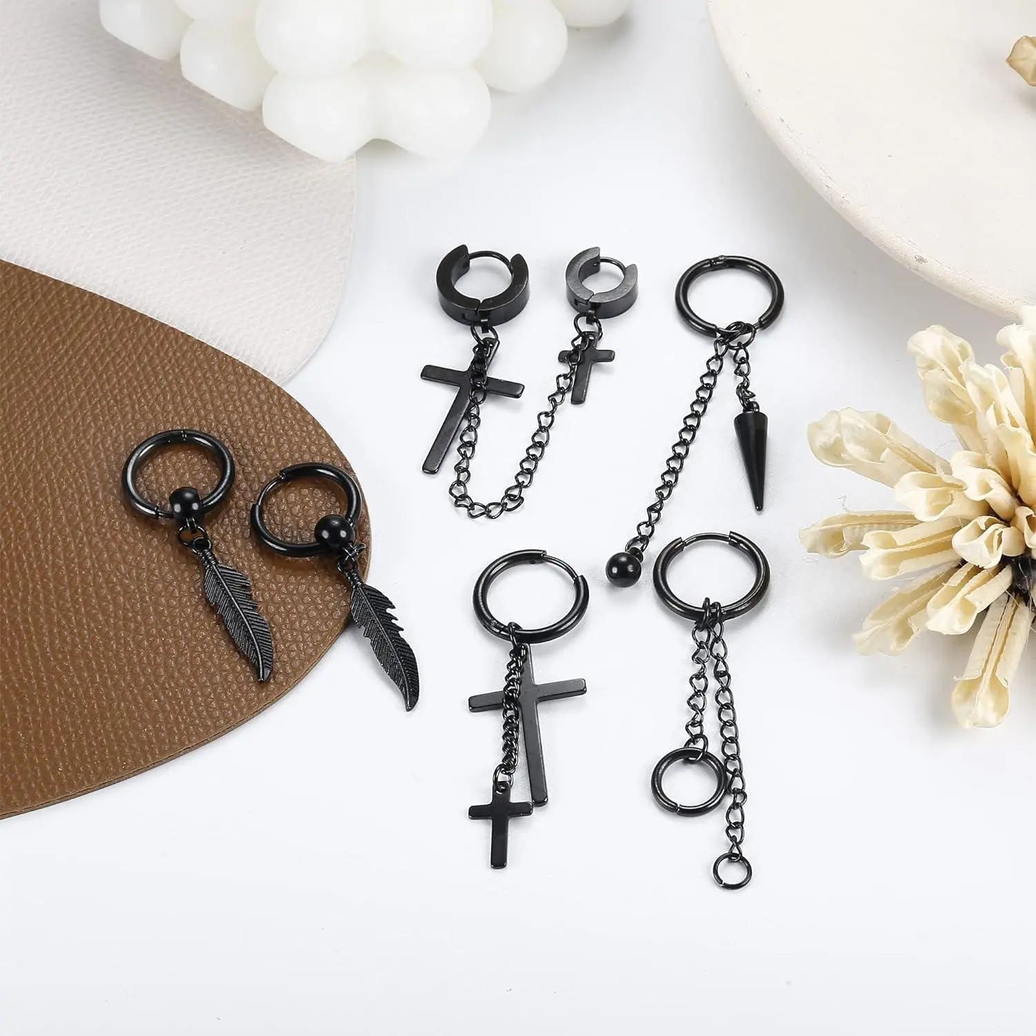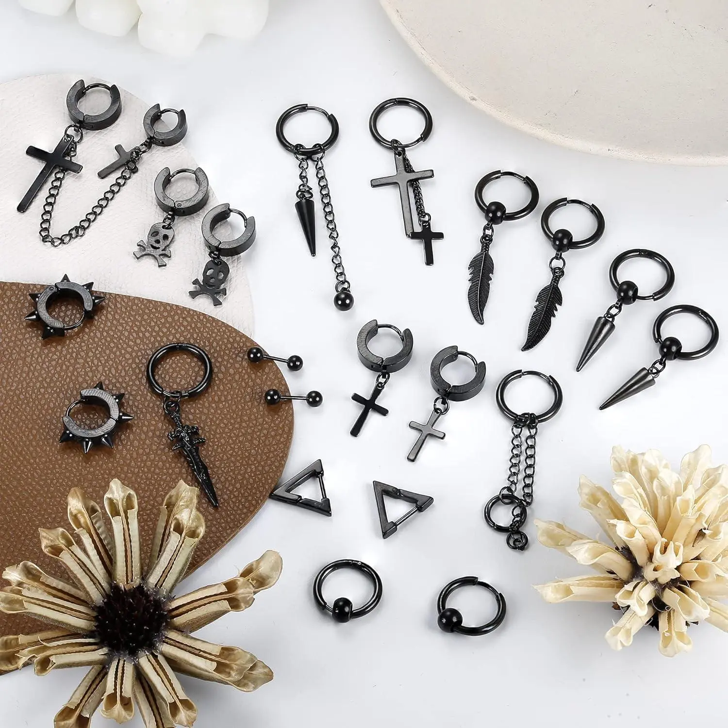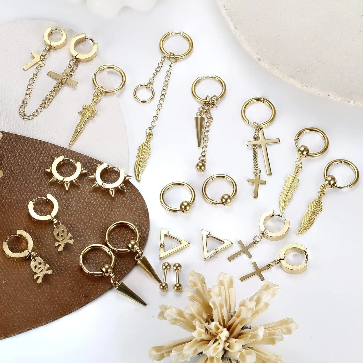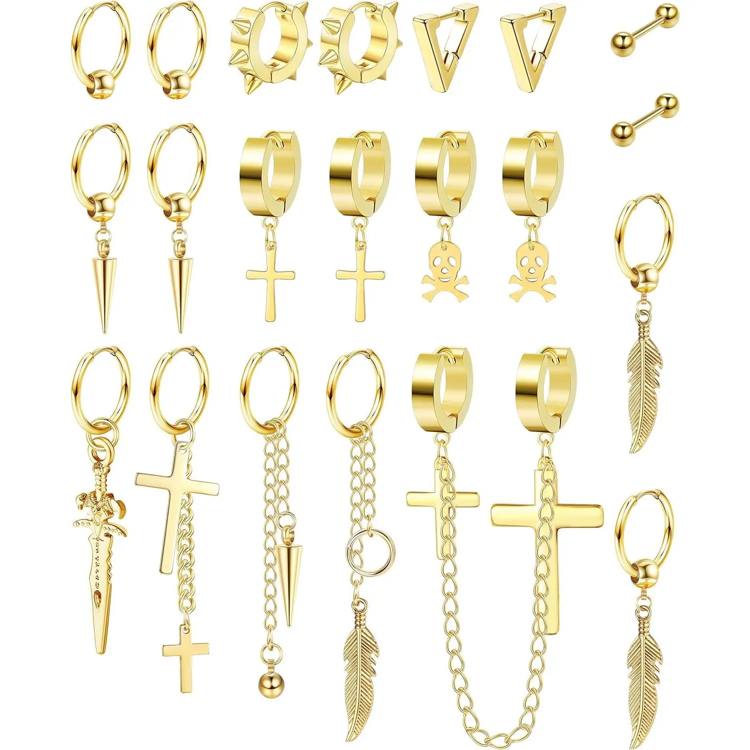 Package Include:21 Pieces mens earrings with a box, including: cross earrings, feather earrings,barbell earrings,dangle earrings, hoop earrings etc. These mens earrings are full of personality and cool, providing you eye-catching look.