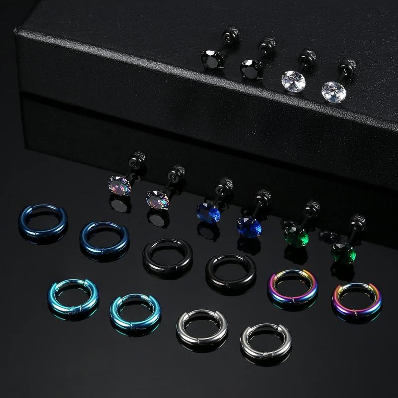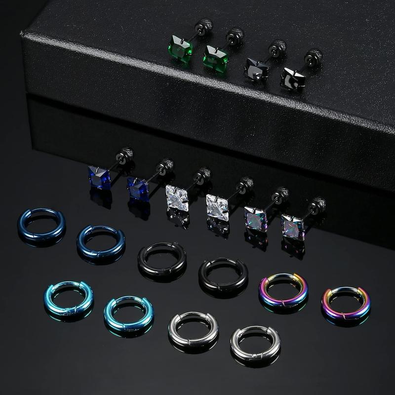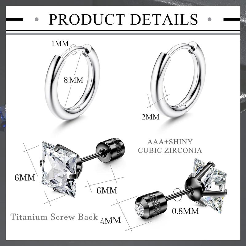 One order includes 5 pairs of titanium screw back earrings and 5 pairs of small hoop earrings. Available in round cz and square cz. A variety of colors and the right size to match your outfits perfectly.