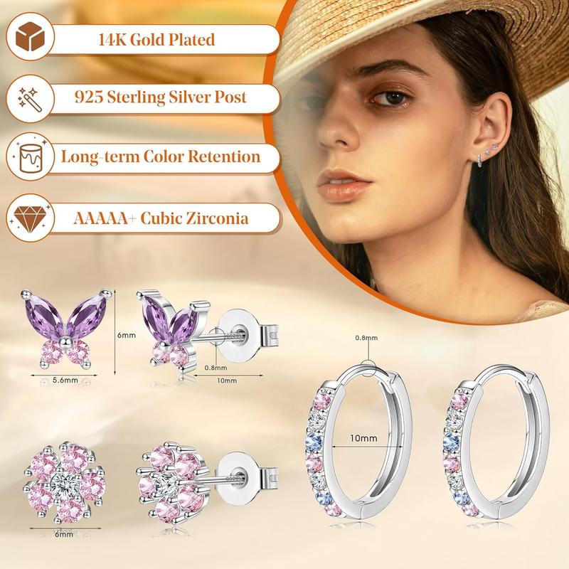 One order contains 3 pairs of silver/gold stud hoop earrings for women of different styles, such as zircon earrings, butterfly earrings, flower earrings and hoop earrings. These silver earrings comes in a variety of styles, whether worn alone or as a layered earrings, it can showcase your charm and is the ideal choice for delicate ladies.