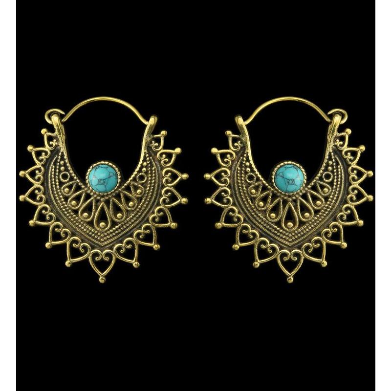 Lightweight yellow brass earrings/hangers with an ornately decorated design with a howlite turquoise stone inlay in the center. Size is 18G. Measures at 40mm x 35mm. Weight is about 14 grams each. Made from brass. Not meant for long term wear. May oxidize under extreme moisture conditions. Sold in pairs (2pc). For healed piercings/lobes.