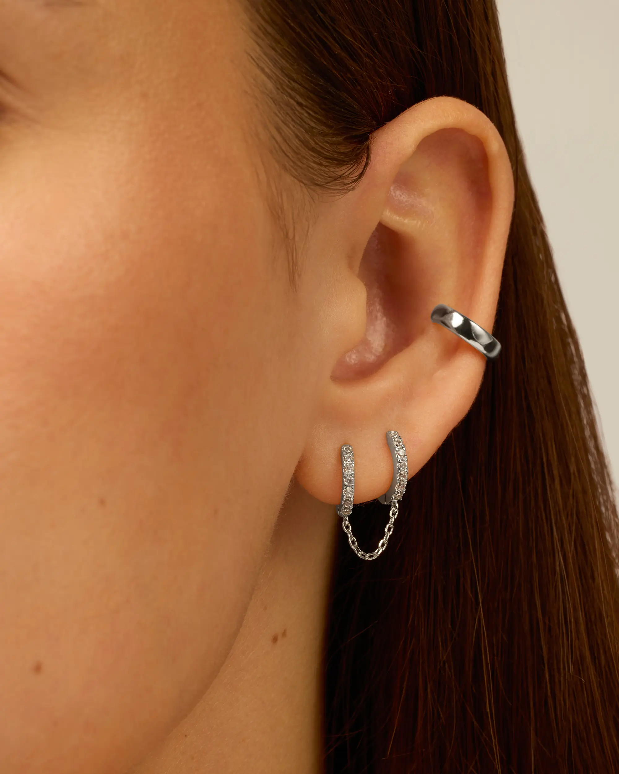 ·Double Piercing Dangle Chain CZ Huggie Hoop Earrings: Twice the fun with two 8mm rhodium-plated CZ mini huggies and a 15mm connecting chain. Suitable for women with 2 or more piercings. Enjoy twice the sparkle!