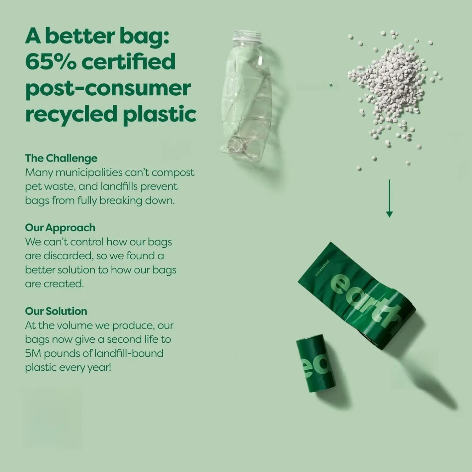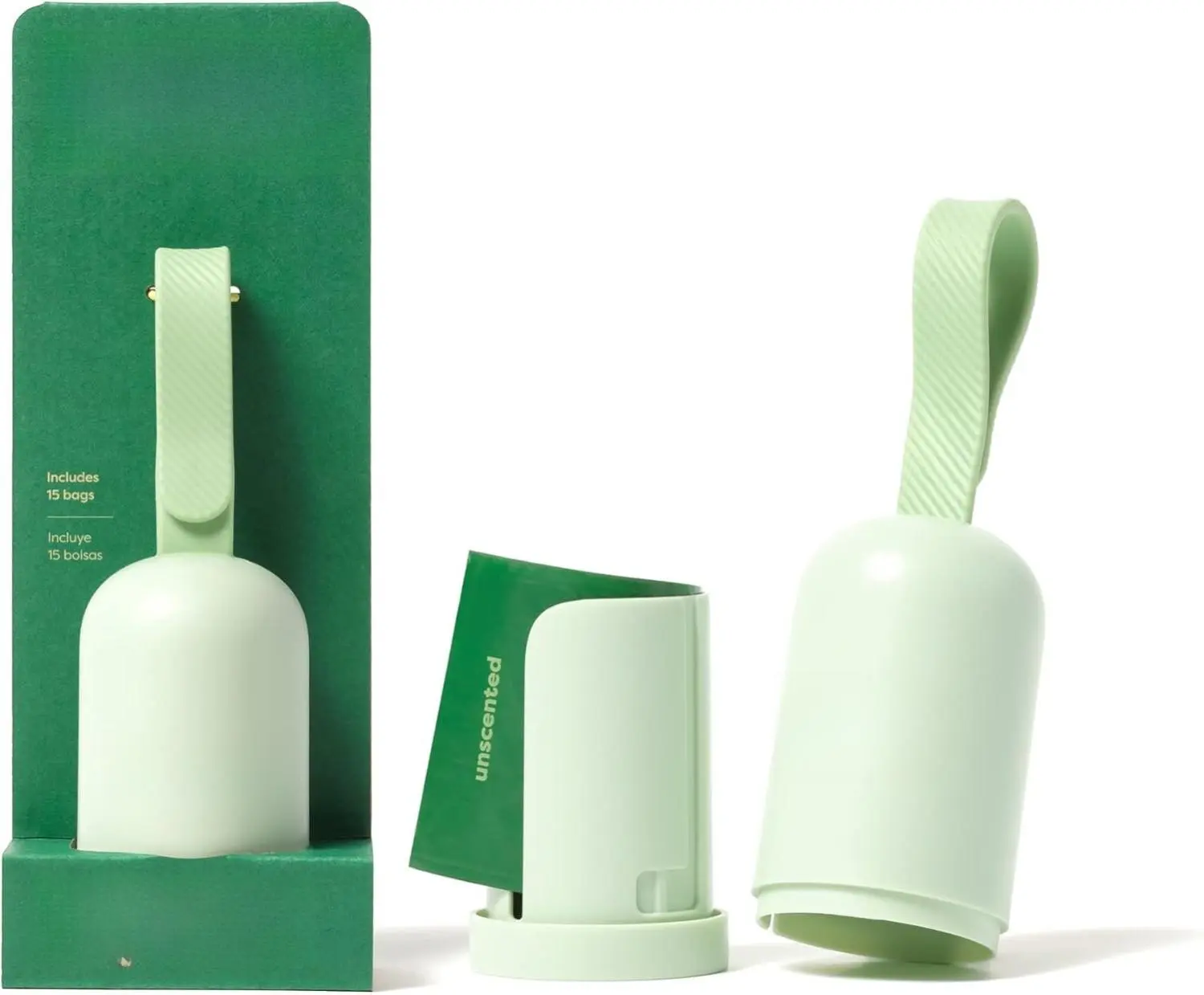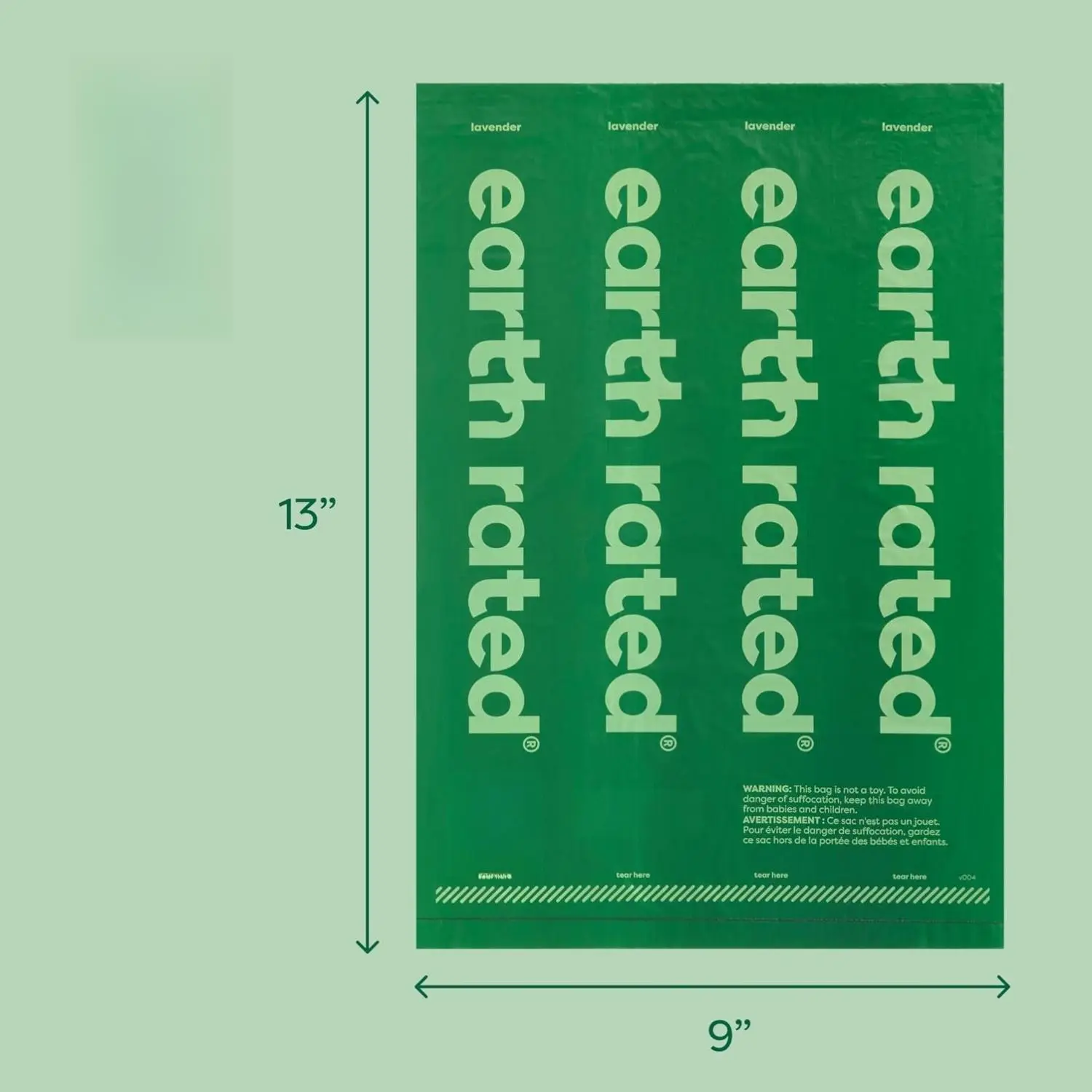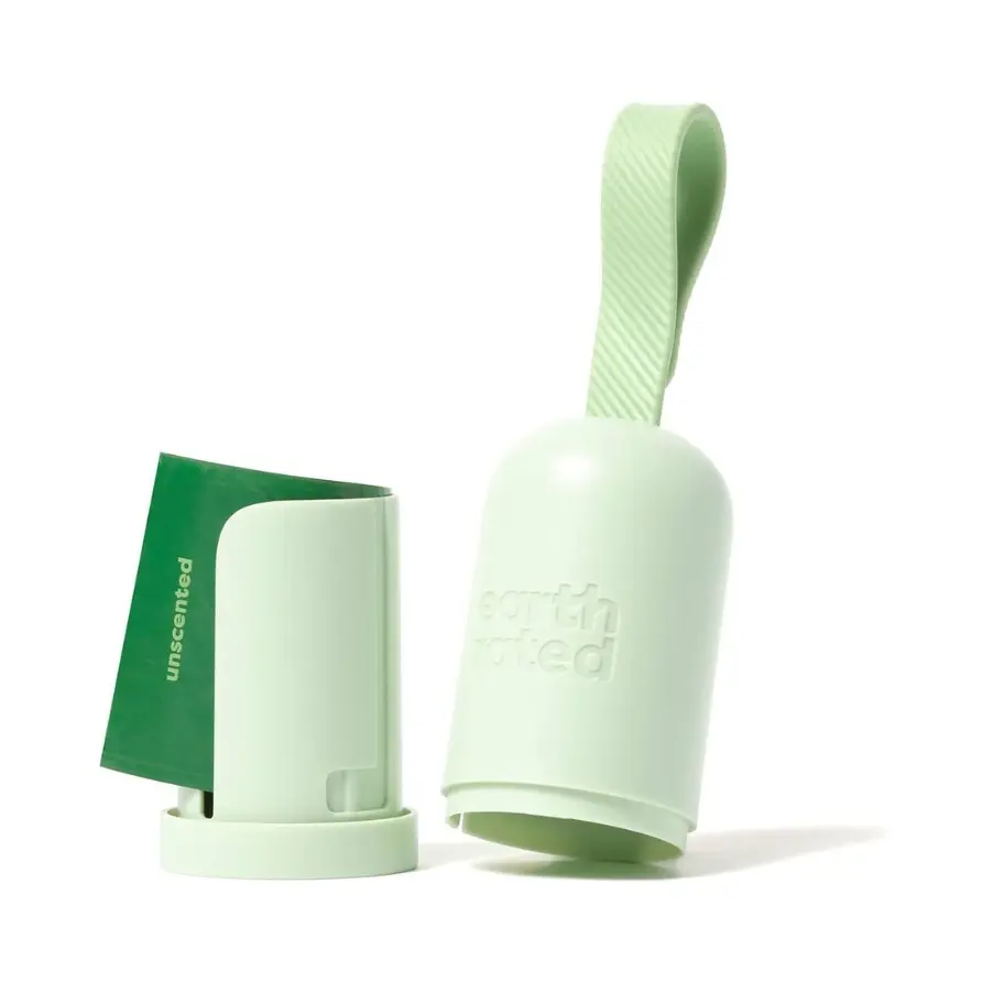 The set includes an Earth Rated Dog Poop Bag Holder and a starter roll of unscented bags. The bags measure 13" L x 9" W. Earth Rated is B Corp Certified, integrating environmental and social considerations. Our mission is to simplify everyday moments for people and their dogs.