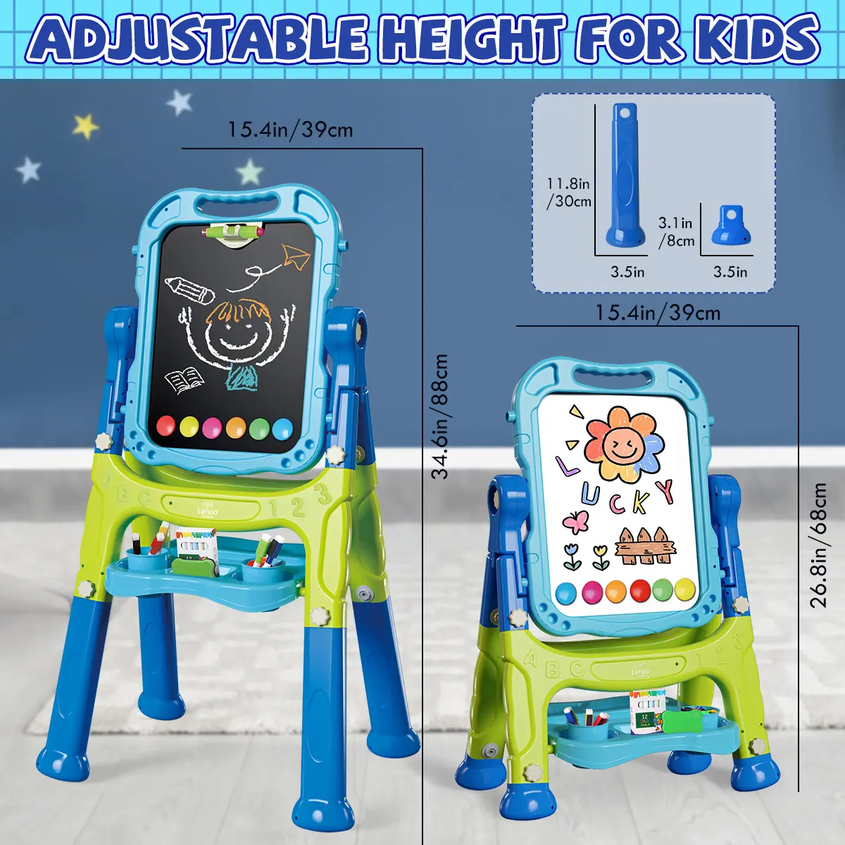 🎨FLEXIBLE HEIGHT ADJUSTMENT - This standing easel for kids can be freely adjusted in two heights: 26.8" (low), 34.6" (high), allowing kids to choose between sitting or standing to create. Meeting the different needs of kids, there is no doubt that it can be used anytime even when your child is grow.