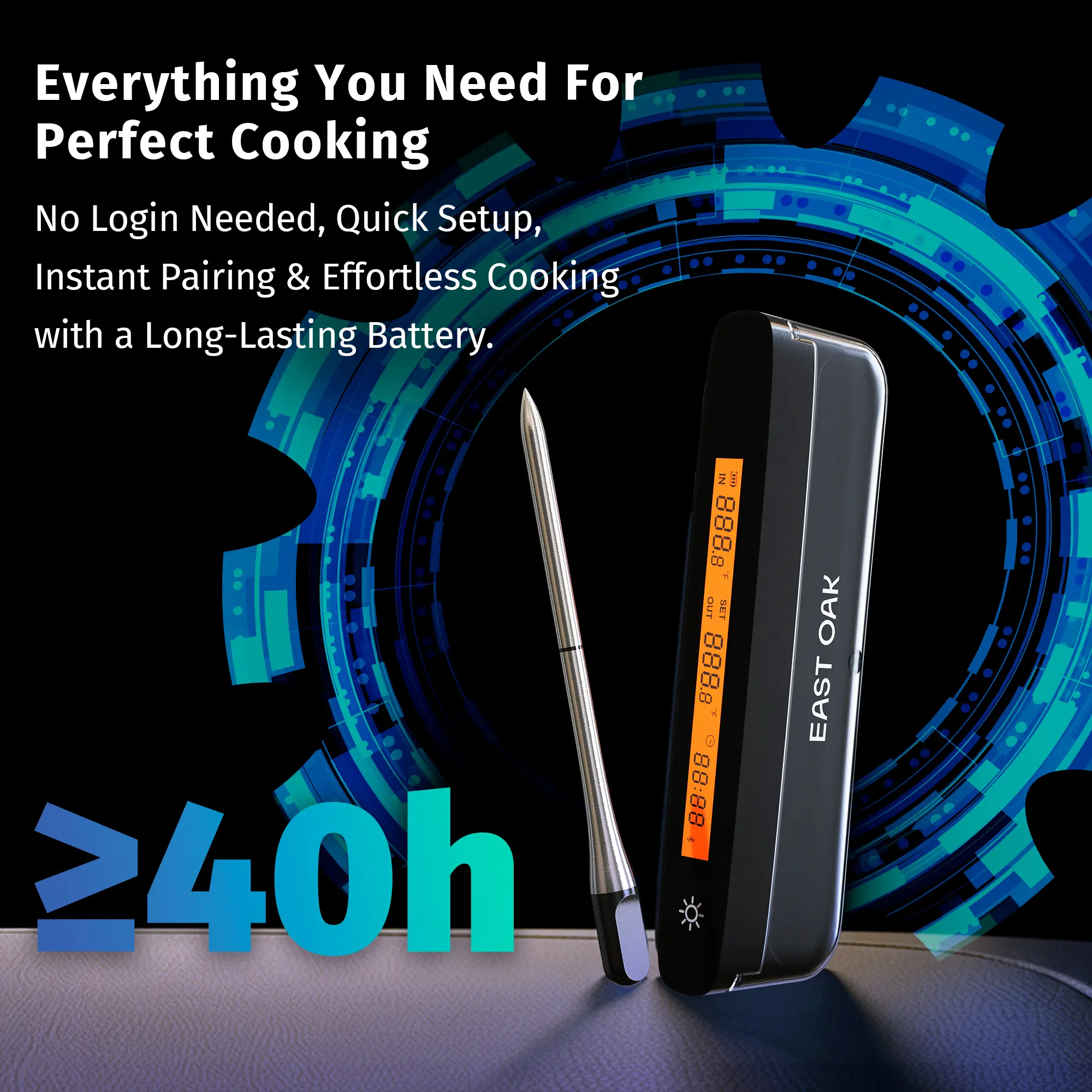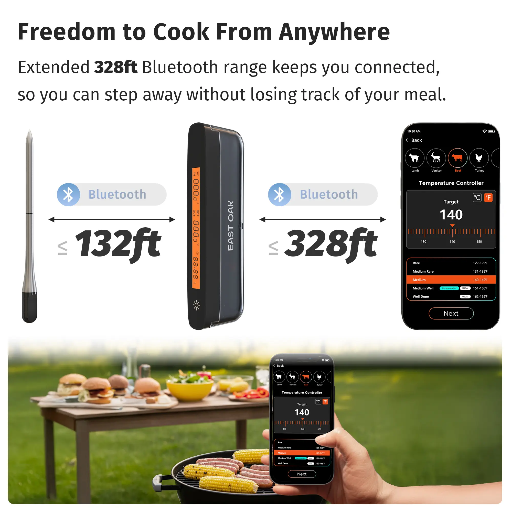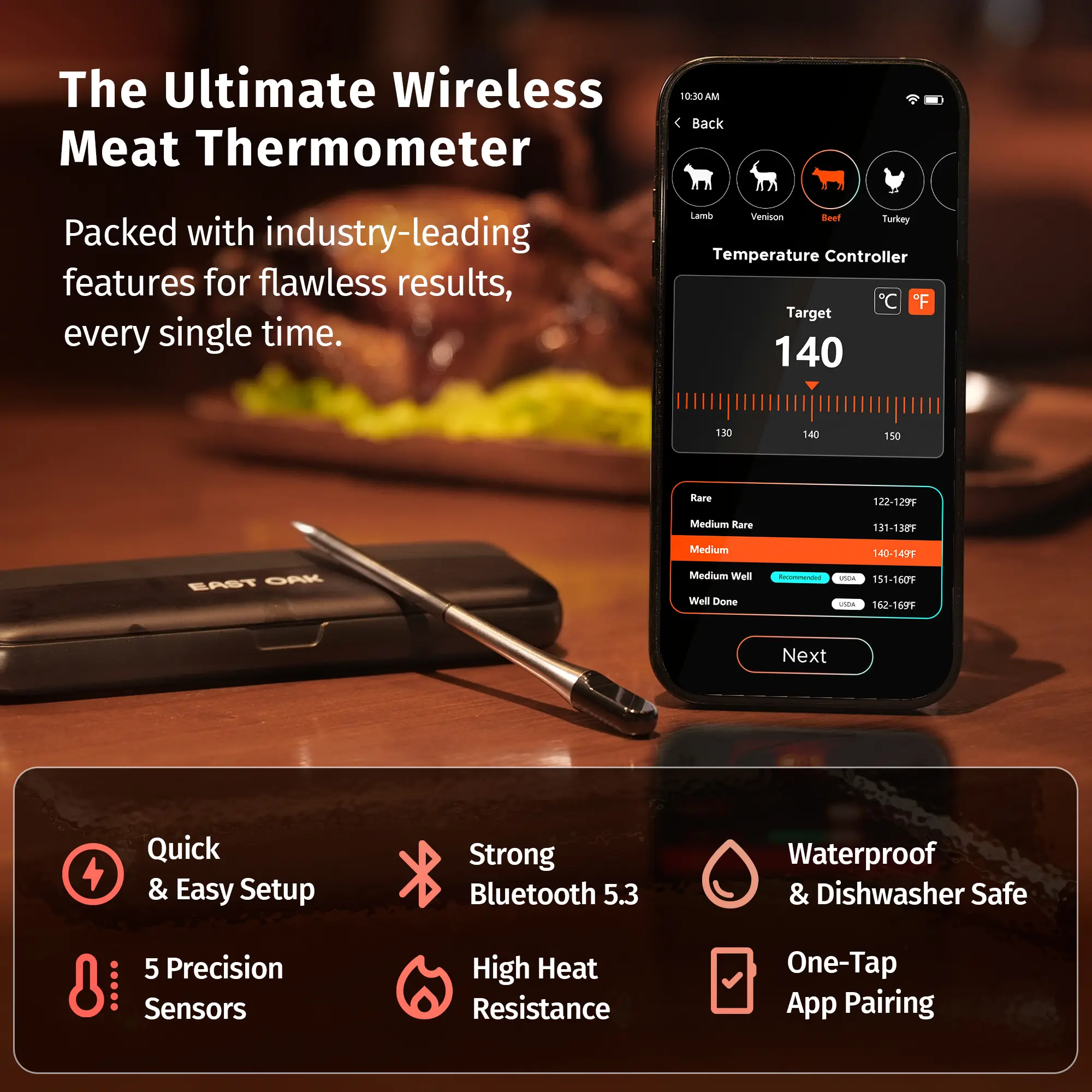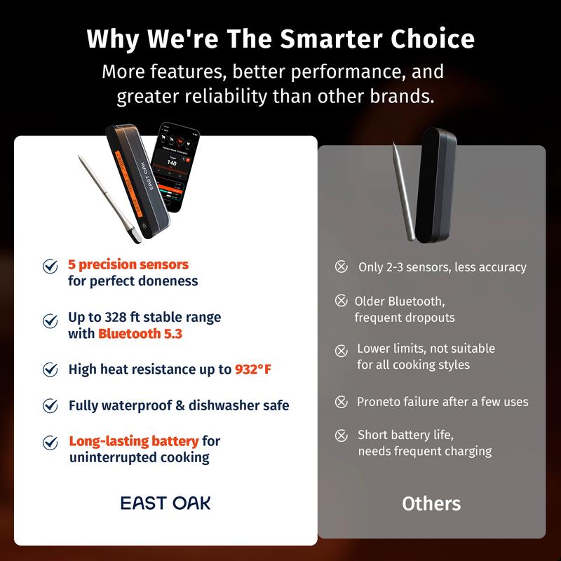 Elevate your cooking with the EAST OAK Smart Bluetooth 5.3 Wireless Meat Thermometer. Perfect for BBQs, grilling, and home cooking, this thermometer ensures flawless results. The five-sensor stainless steel probe delivers edge-to-center accuracy. Connect via Bluetooth 5.3 for a range of up to 328 ft (100m). Monitor your cook from anywhere, no hovering required.