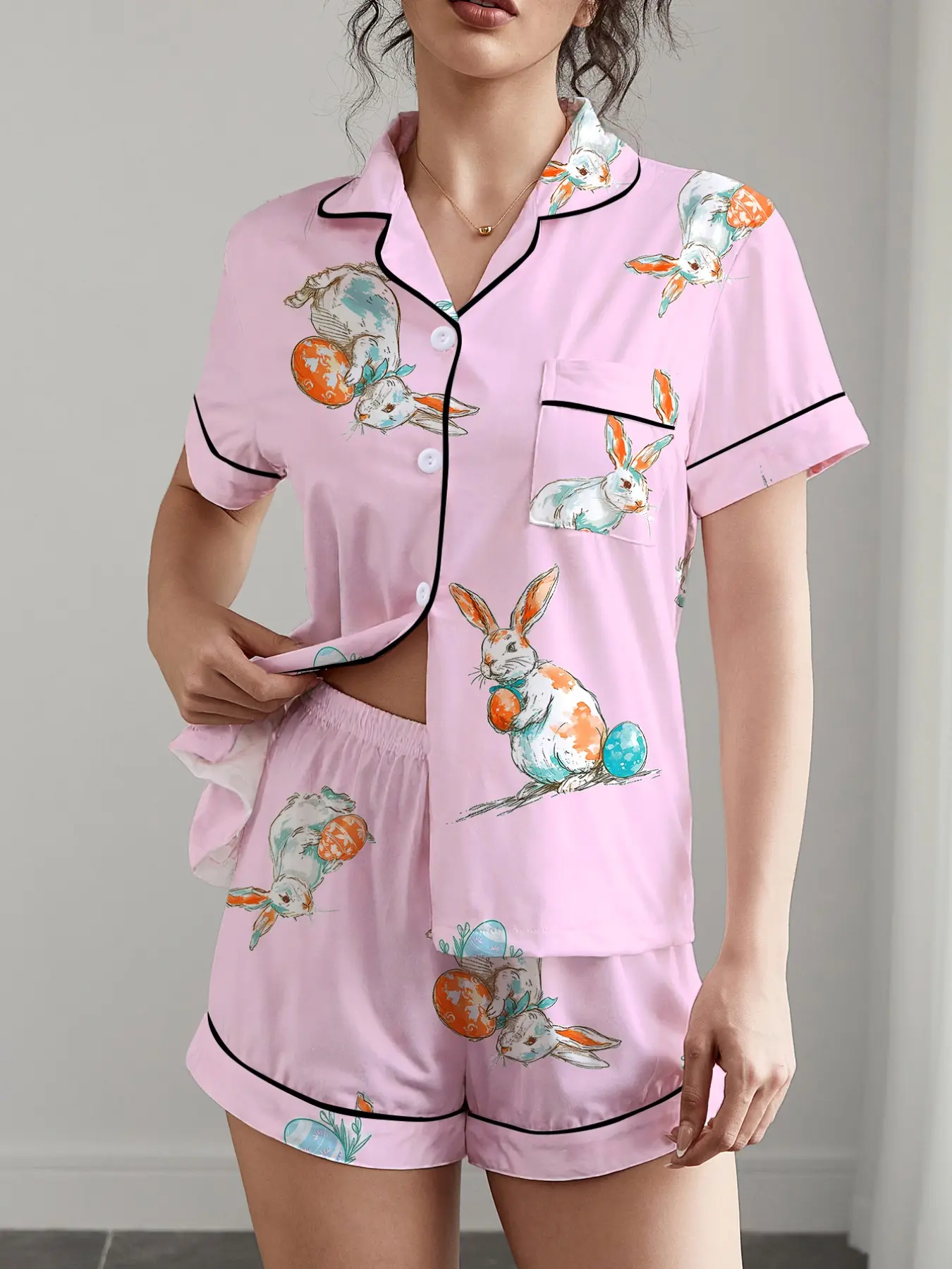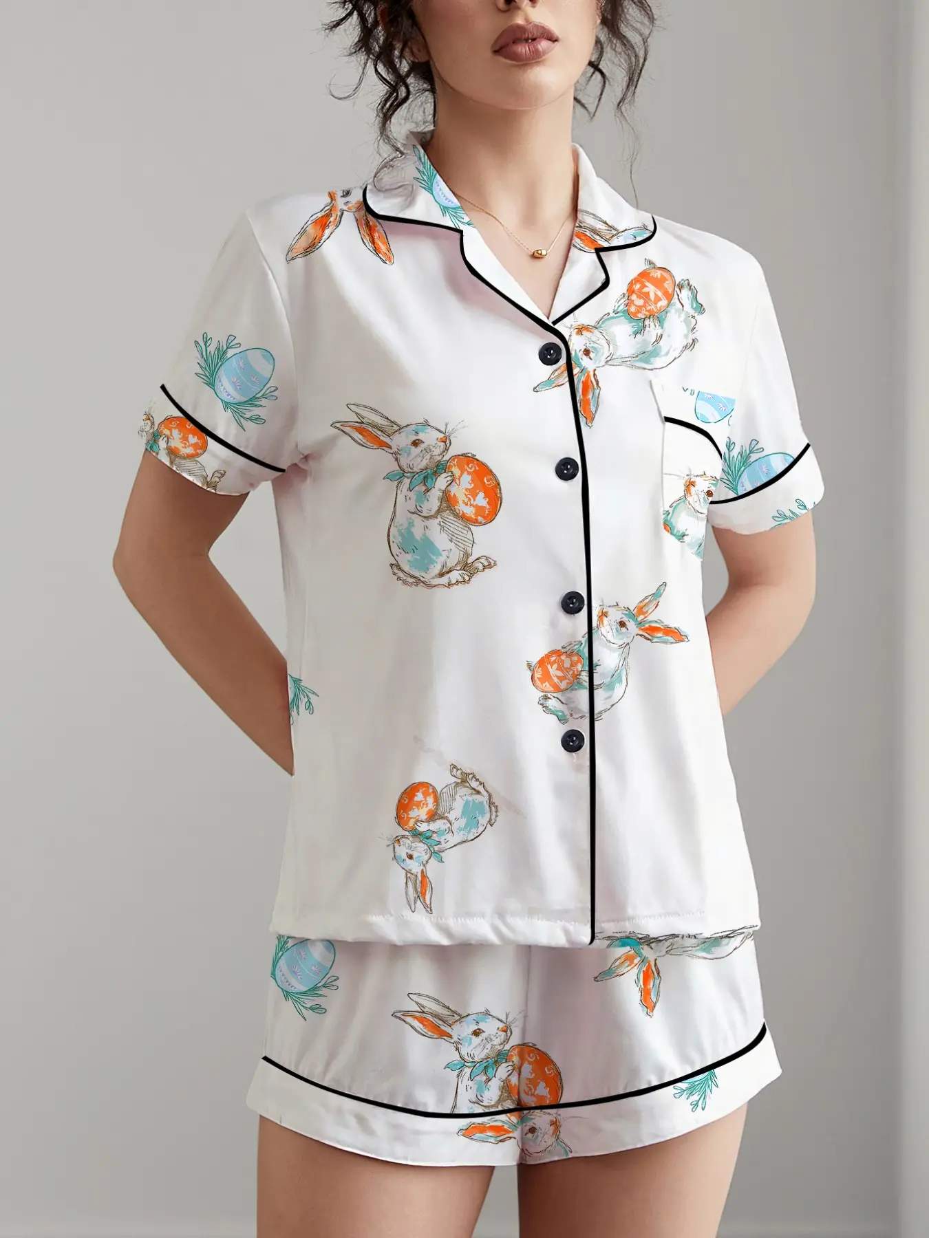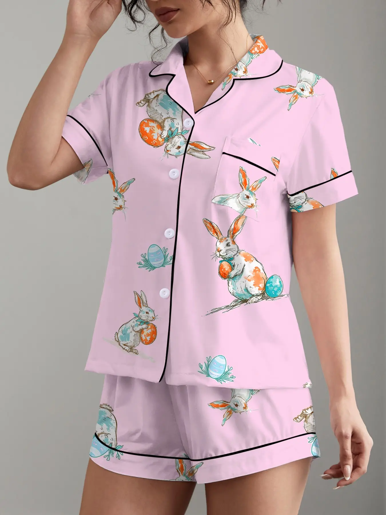 5. Easter 2 Piece Women's Pajama Set with Rabbit and Egg Print, Short Sleeve Button-Up Top and Loose Stretch Shorts, Casual Comfortable Sleepwear for Holidays and Everyday Wear