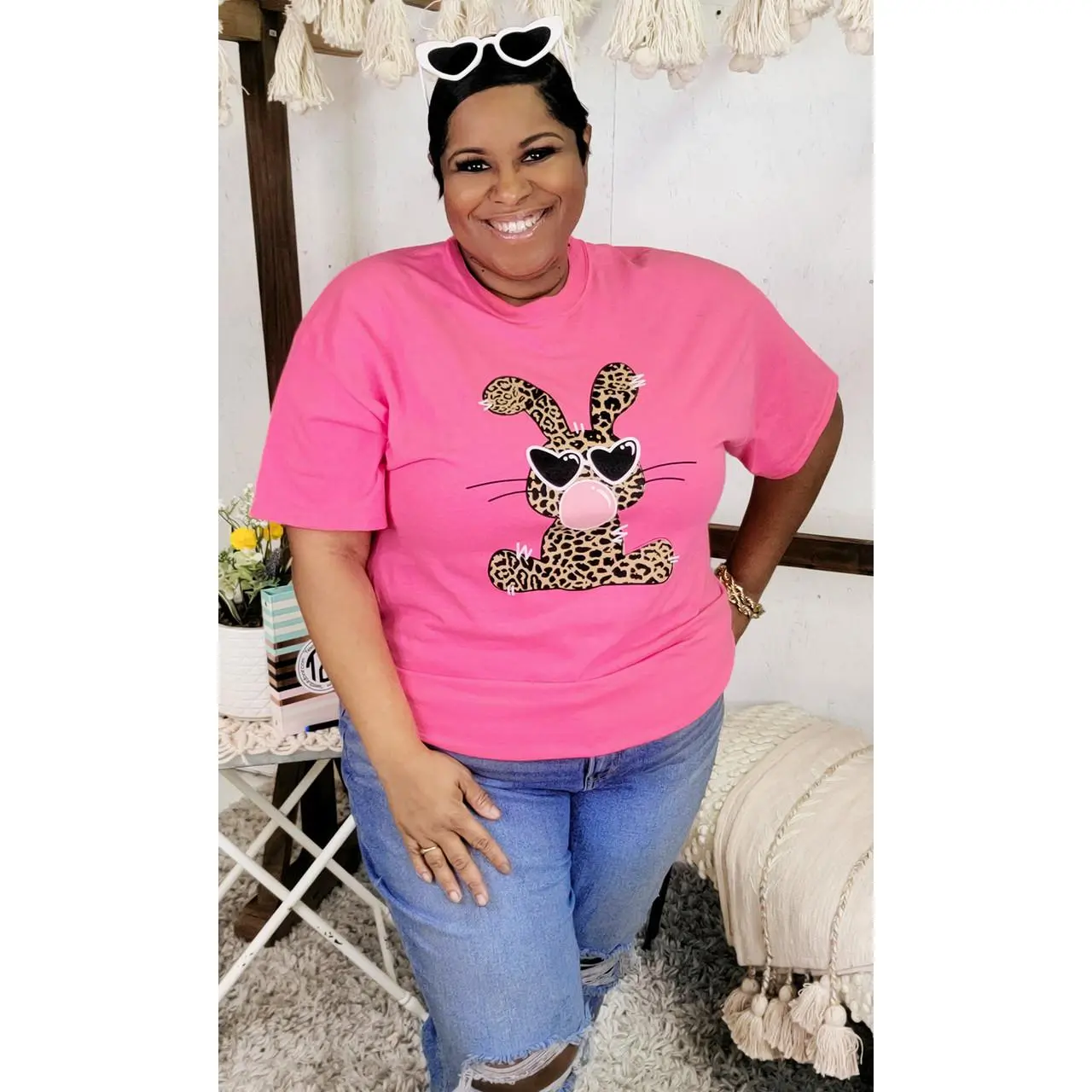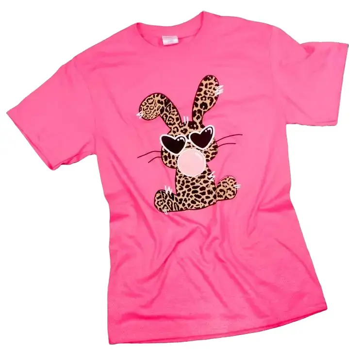 • Leopard print bunny graphic for a trendy, playful look