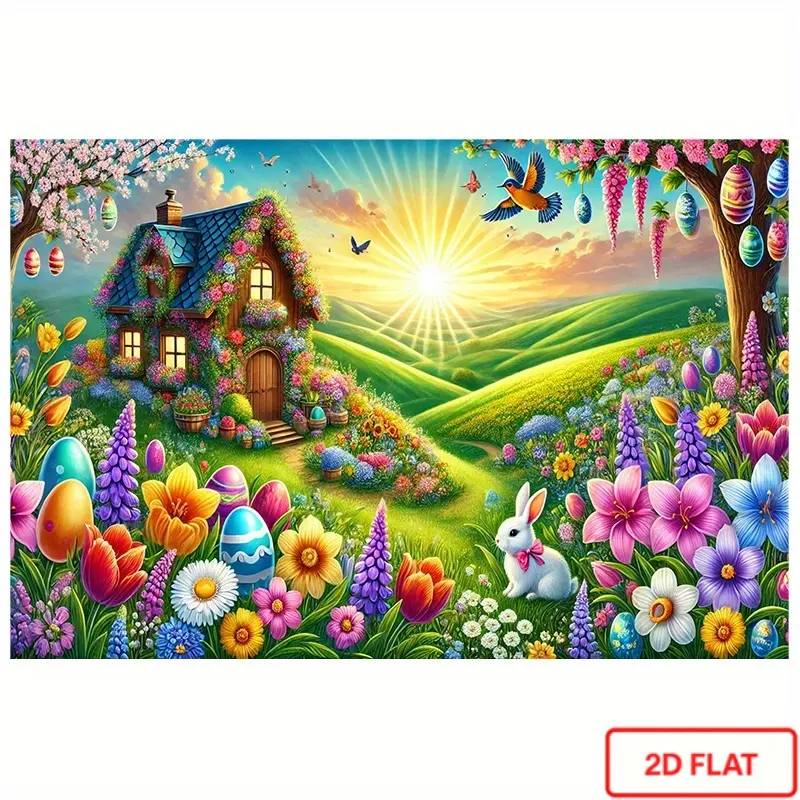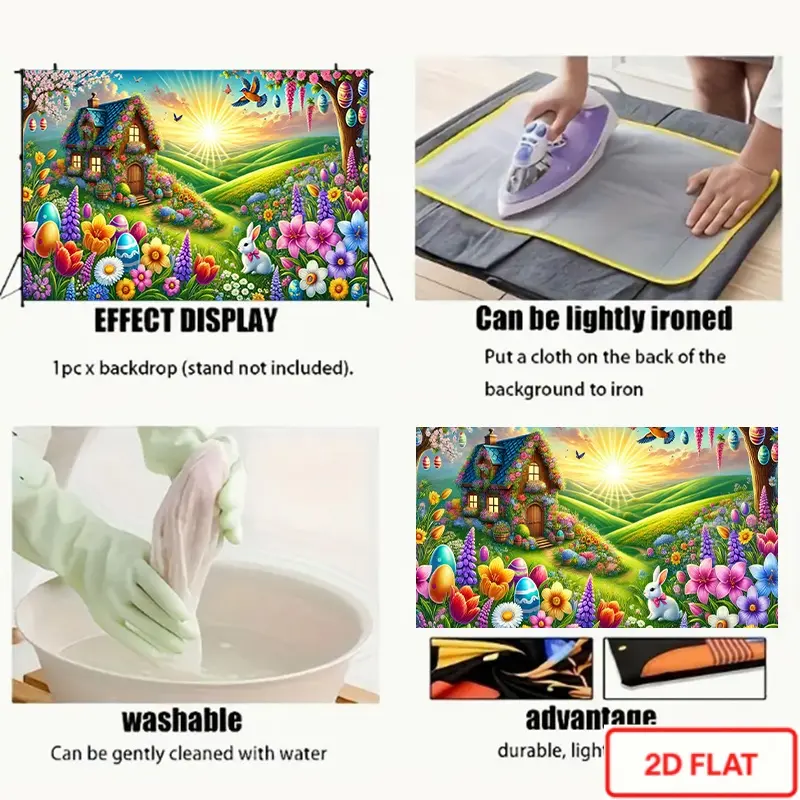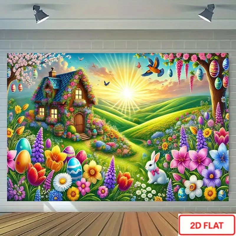 1pc Spring Cottage Easter Bunny & Tulip Cottage Backdrop - Large Horizontal Pastel Egg & Tulip Wall Hanging with Smiling House Design, Durable Polyester Fabric for Party Decorations, Easter Egg H