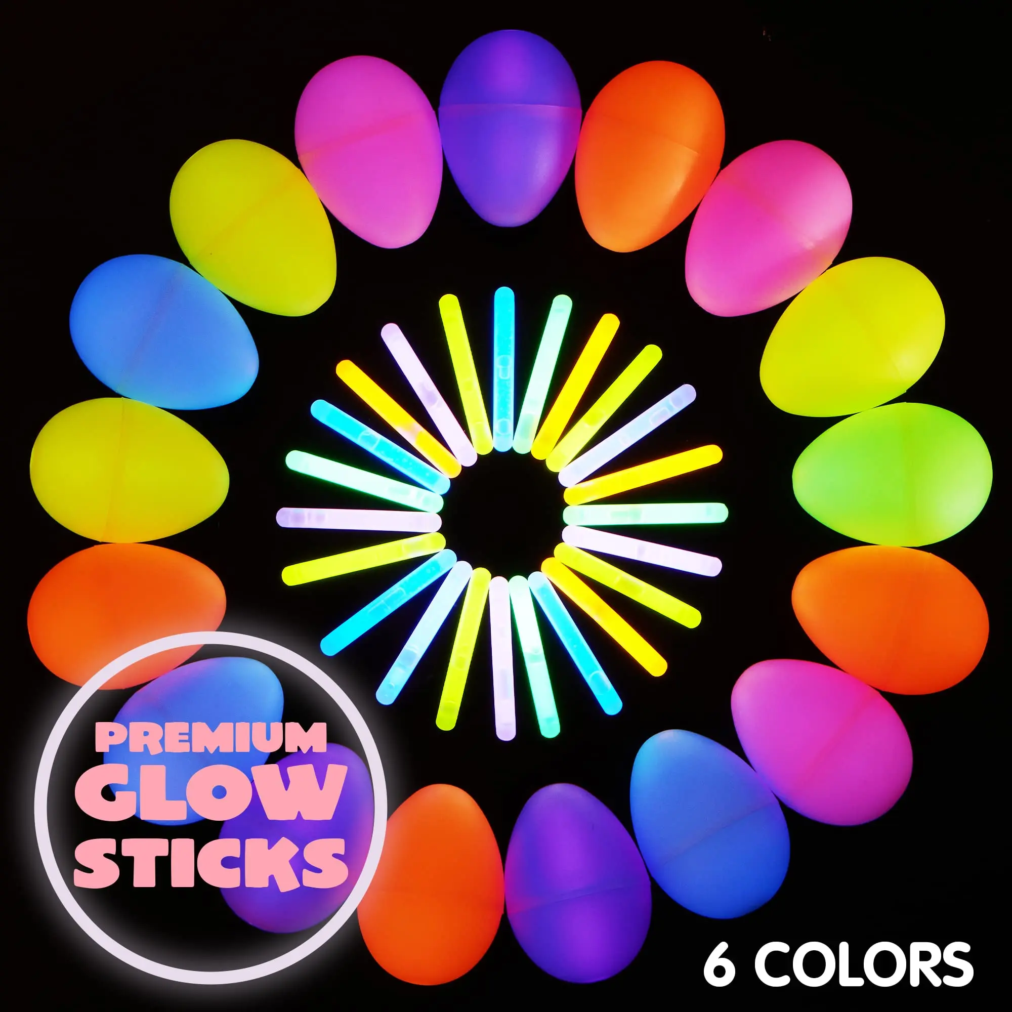 ·216pcs (72 Eggs & 144 Glow Sticks): Our Easter Eggs with ultra glow sticks Set includes 72 pcs easter egg in 3.14inch and 72 pcs glow sticks.
