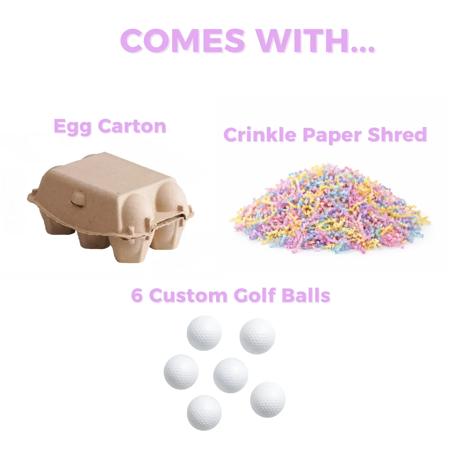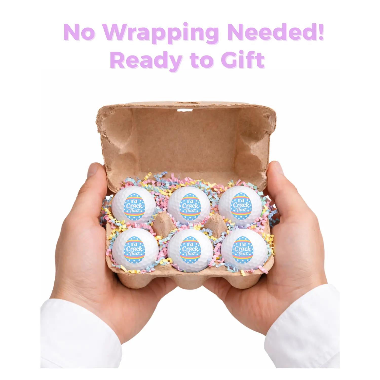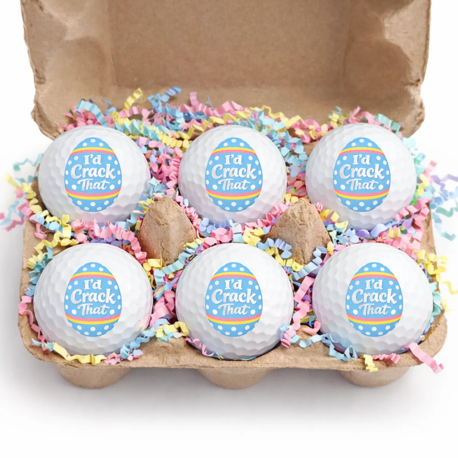 • (6) Premium White Golf Balls • Easter Egg Carton Style Packaging • Pastel Easter Crinkle Paper Filling • Ready-to-Gift Presentation