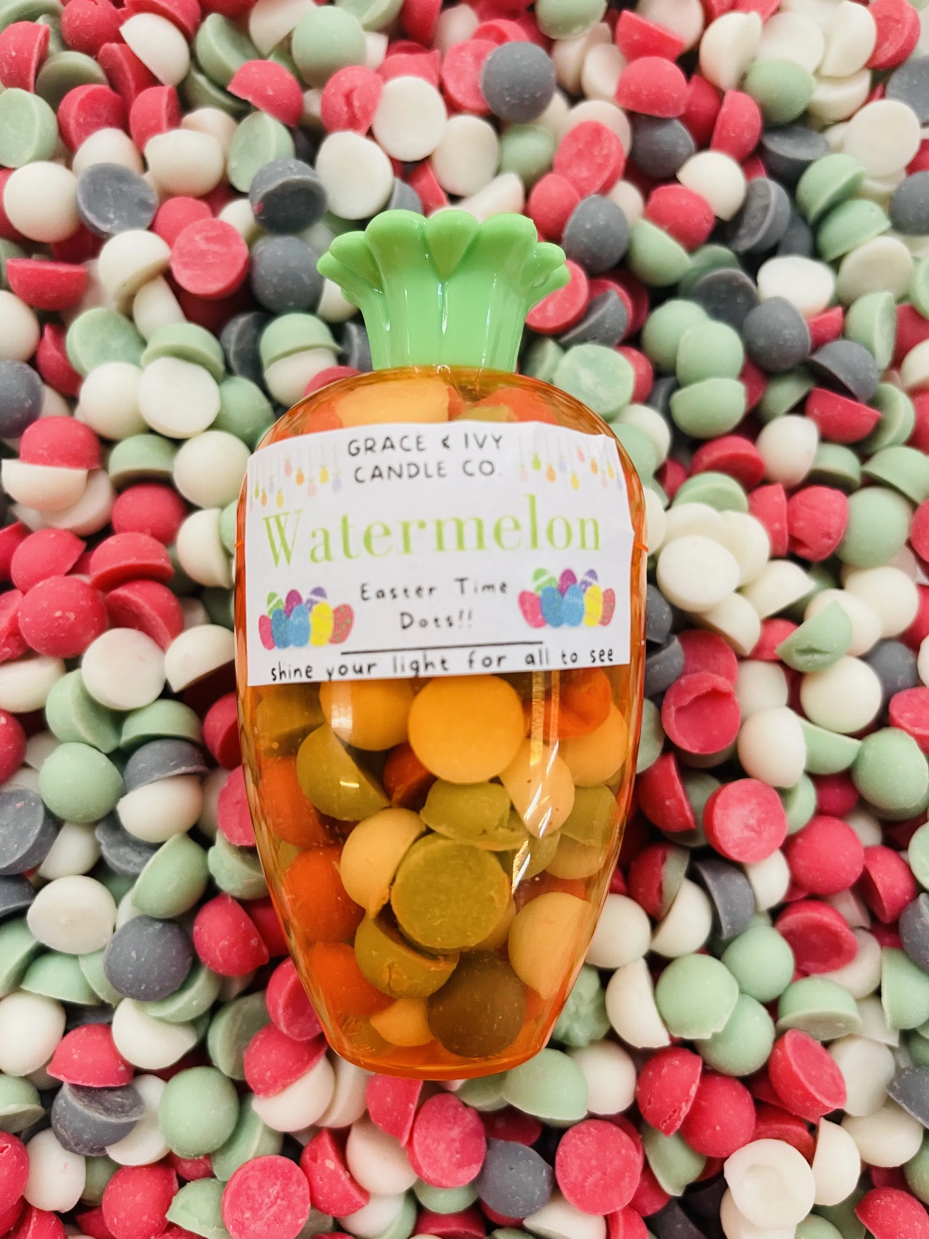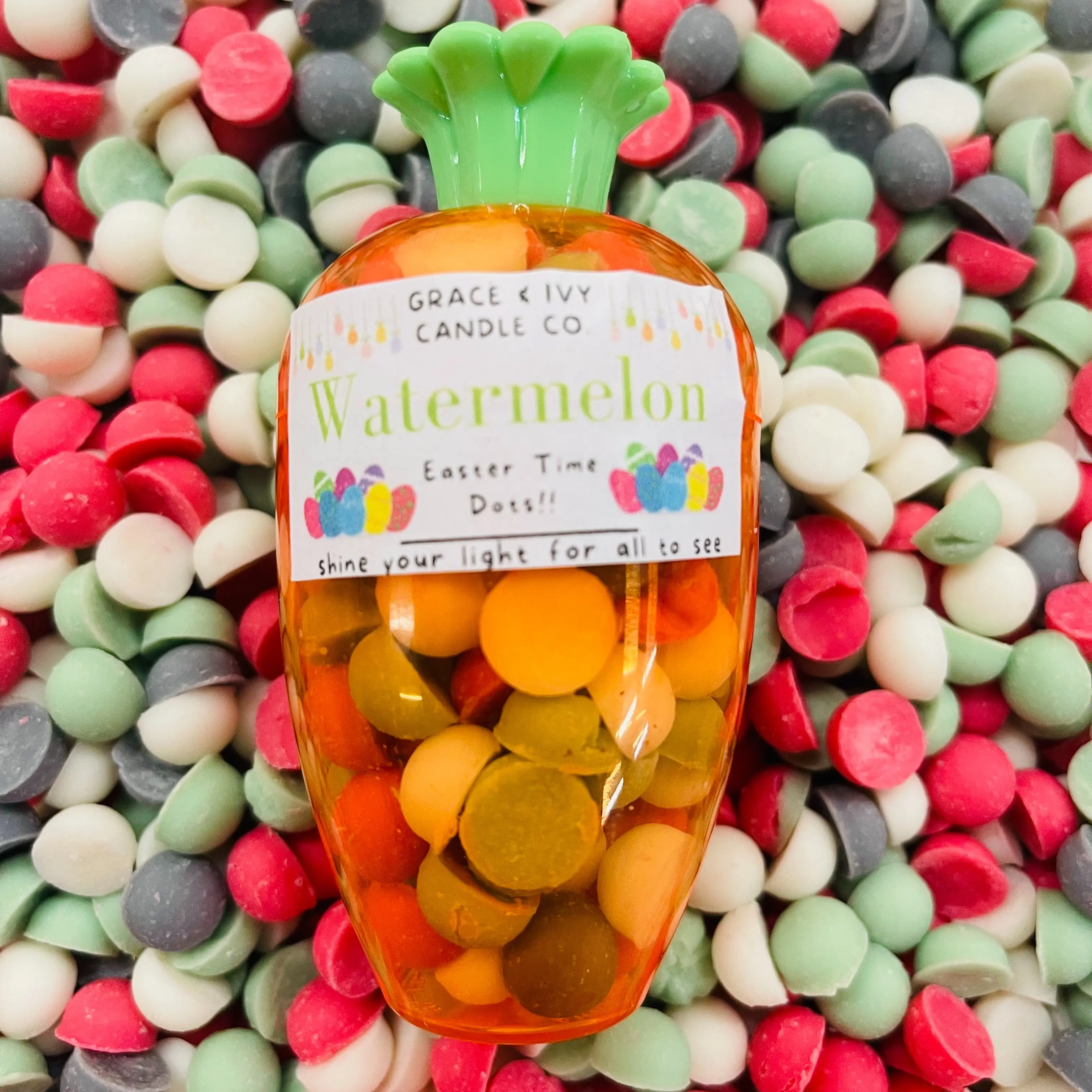 ·Our Easter Carrot is in our Watermelon Sunshine. White, red, green and black wax dots all scented in our fresh-cut watermelon, honeydew and sugar scent.