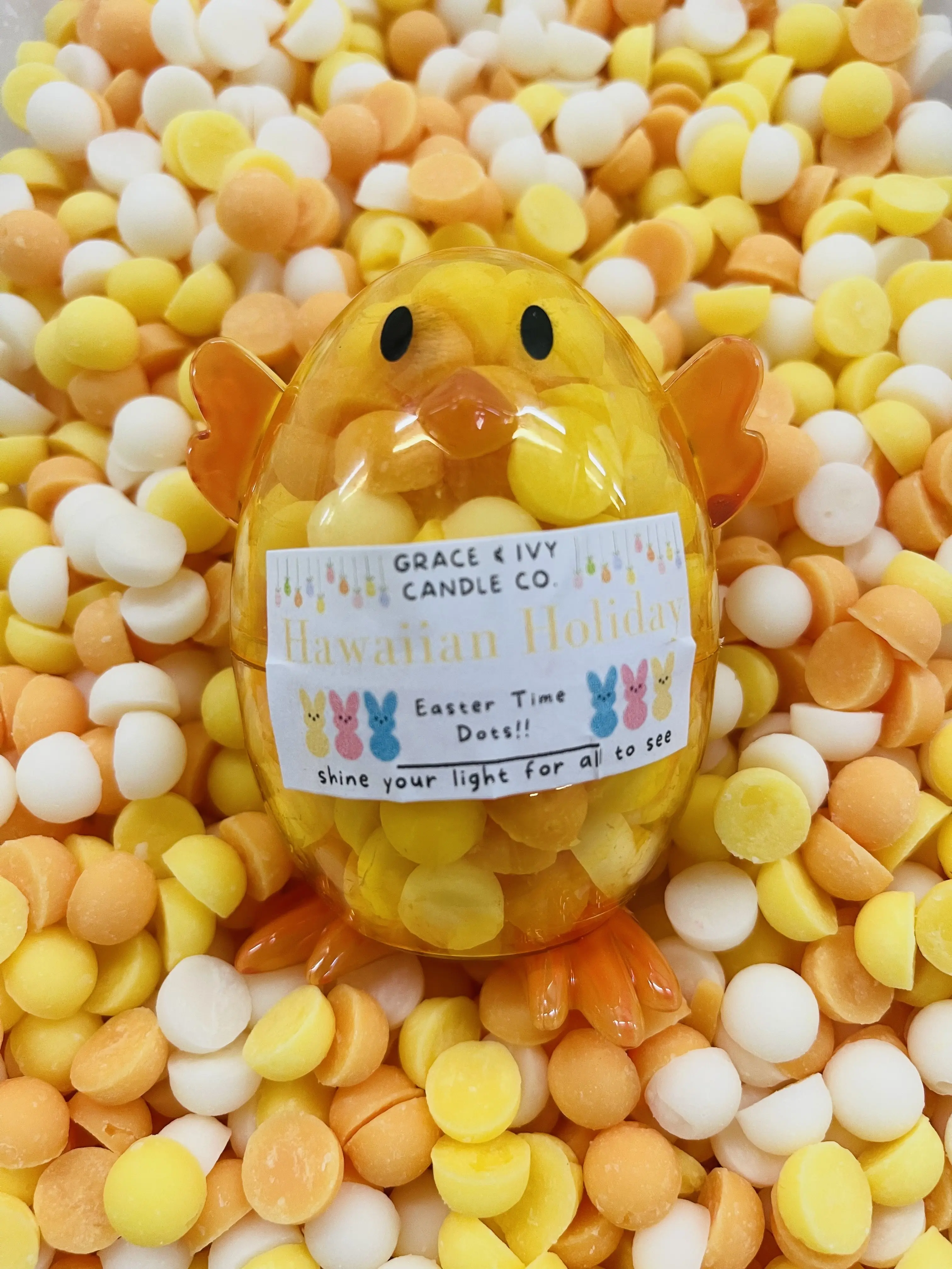 ·Our Baby Easter Chick is in our Hawaiian Holiday. Orange, yellow and white wax dots all scented in our hibiscus, pineapple, coconut, sea salt, agave nectar, and sugarcane scent. It’s giving luau under the stars.