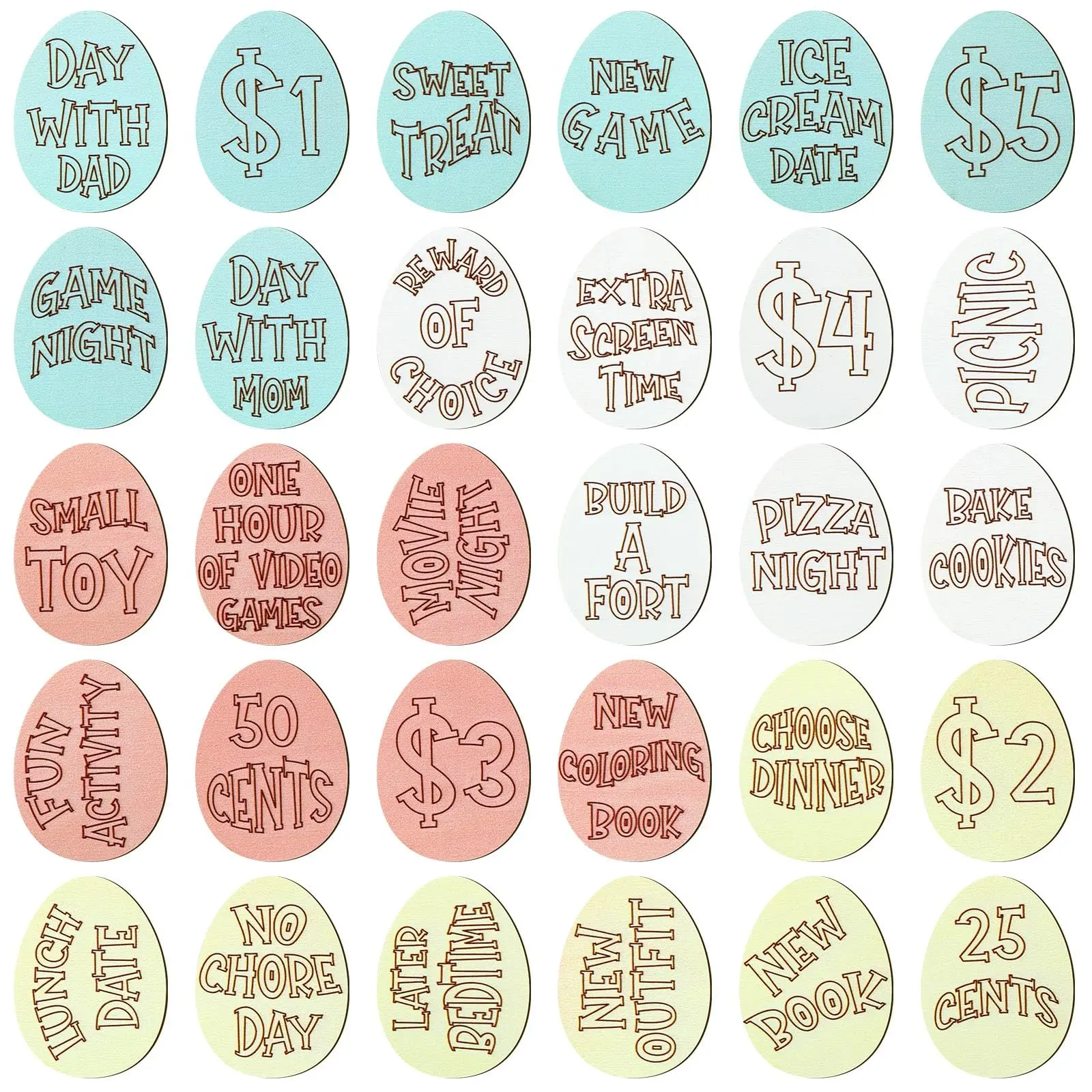 You will receive 30 wooden Easter egg tokens in 30 different styles.