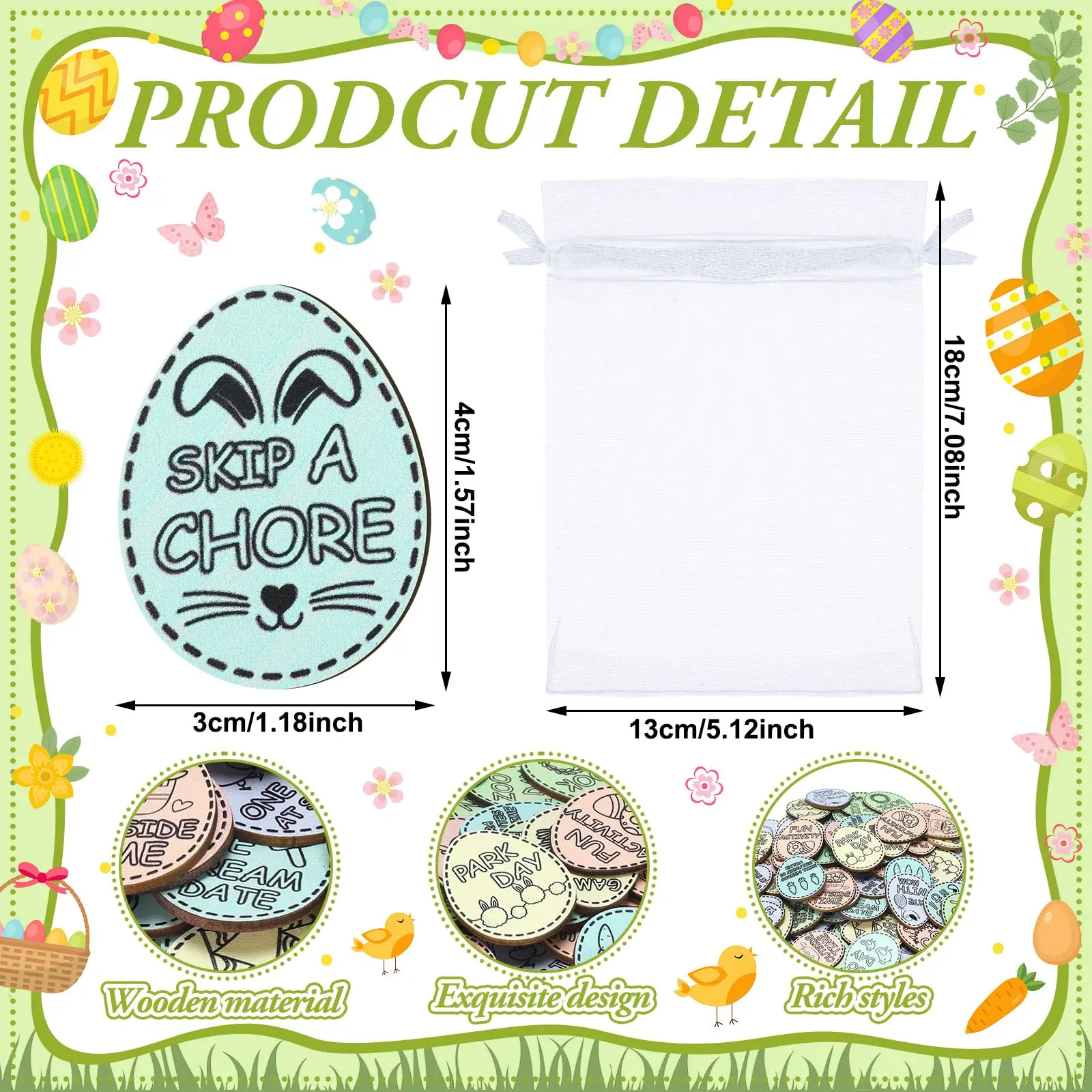 You will receive 120 wooden Easter egg tokens in 30 different styles, 4 of each kind and 1 pieces of white organza bags.