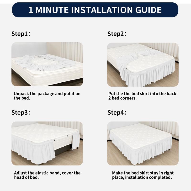 Design Concept: It is very easy to put on and take off.You don't need to lift the mattress.The bed skirt can be fixed on the bed by adjusting the length of elastic band. Even to a female,it is very easy to operate, very labor-saving and time saving.