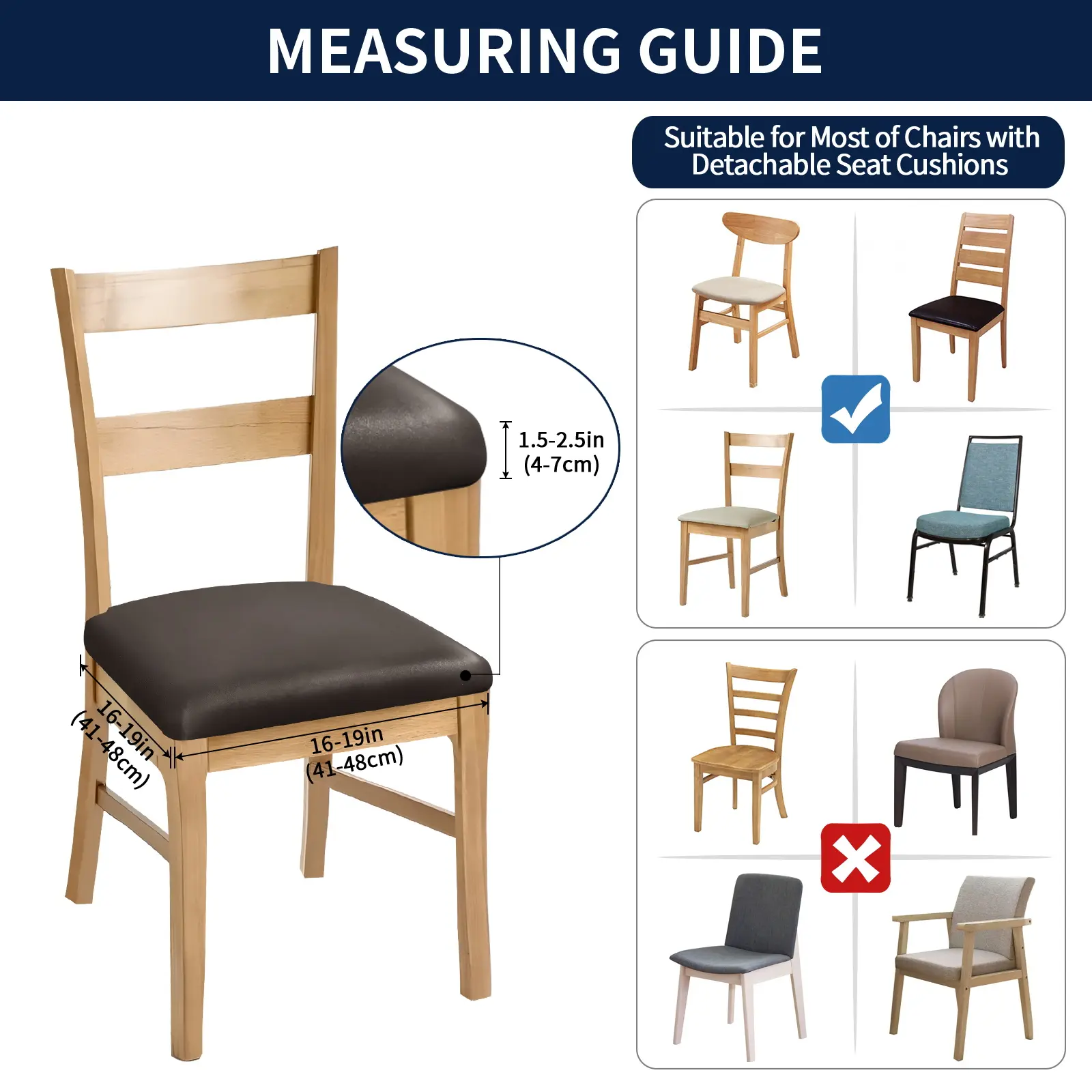 Pay attention to the Size: 4/6 counts in a set. These chair covers are suitable for seat cushions that are 16"-19'' long, 16"-19'' wide, and 1.5"-2.5" thick.