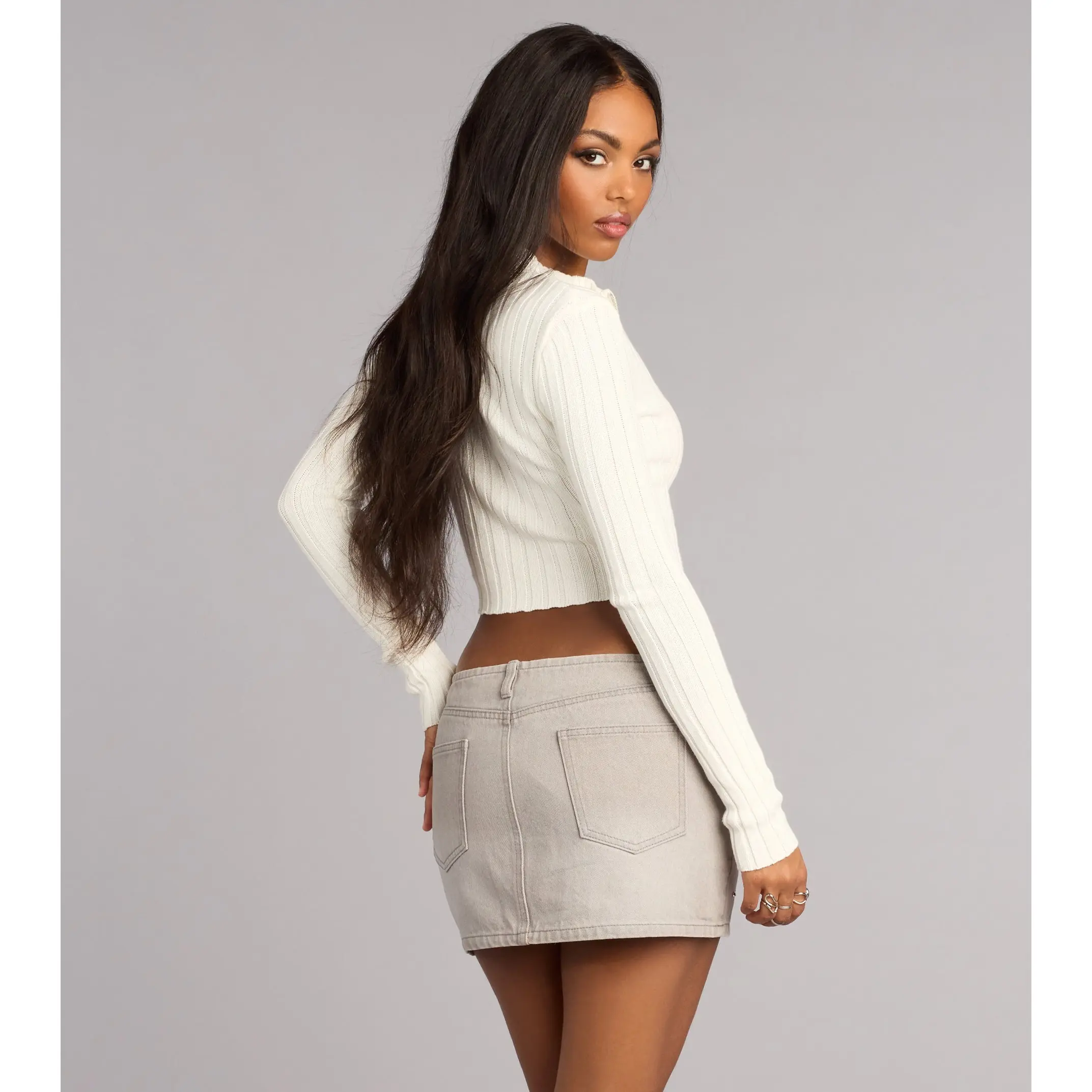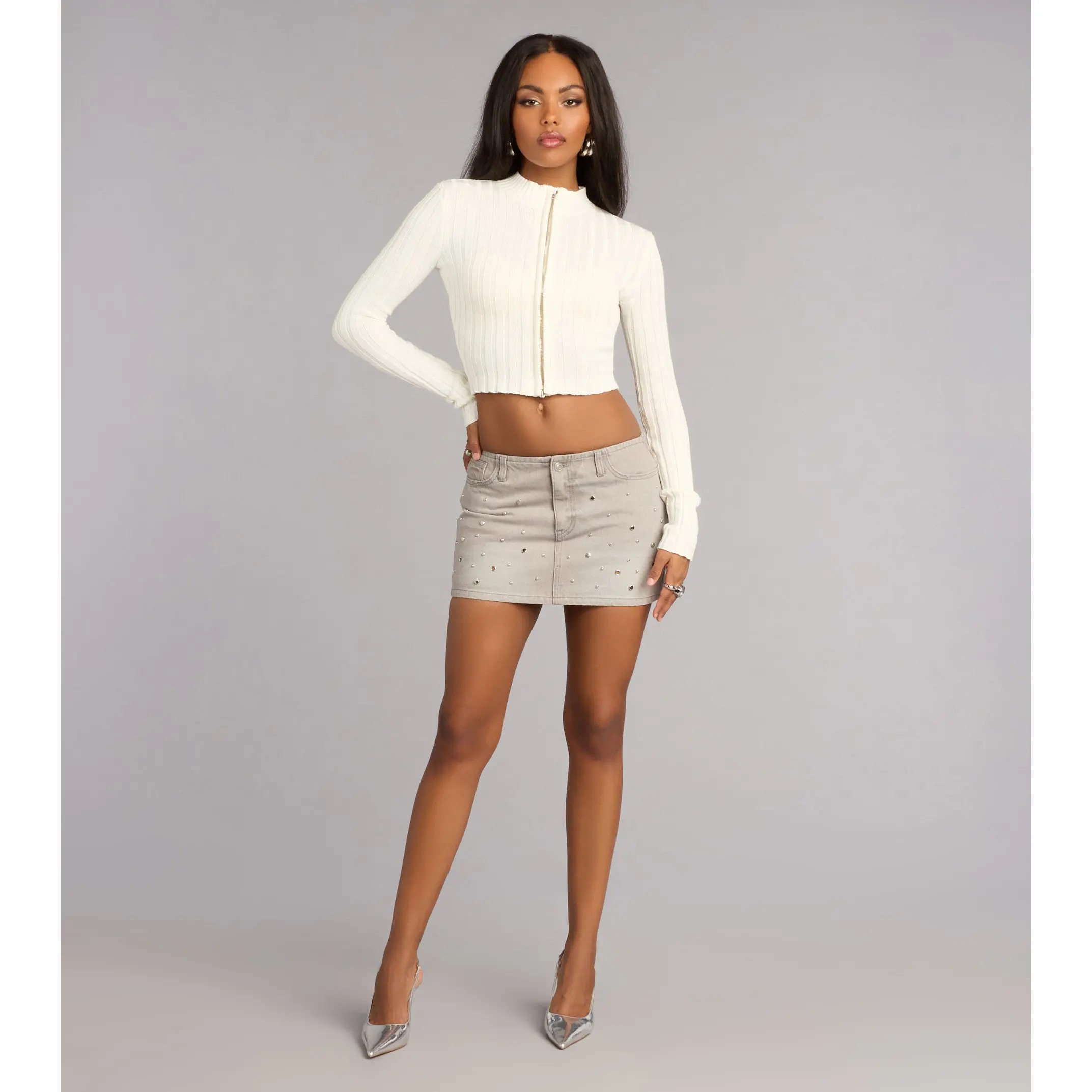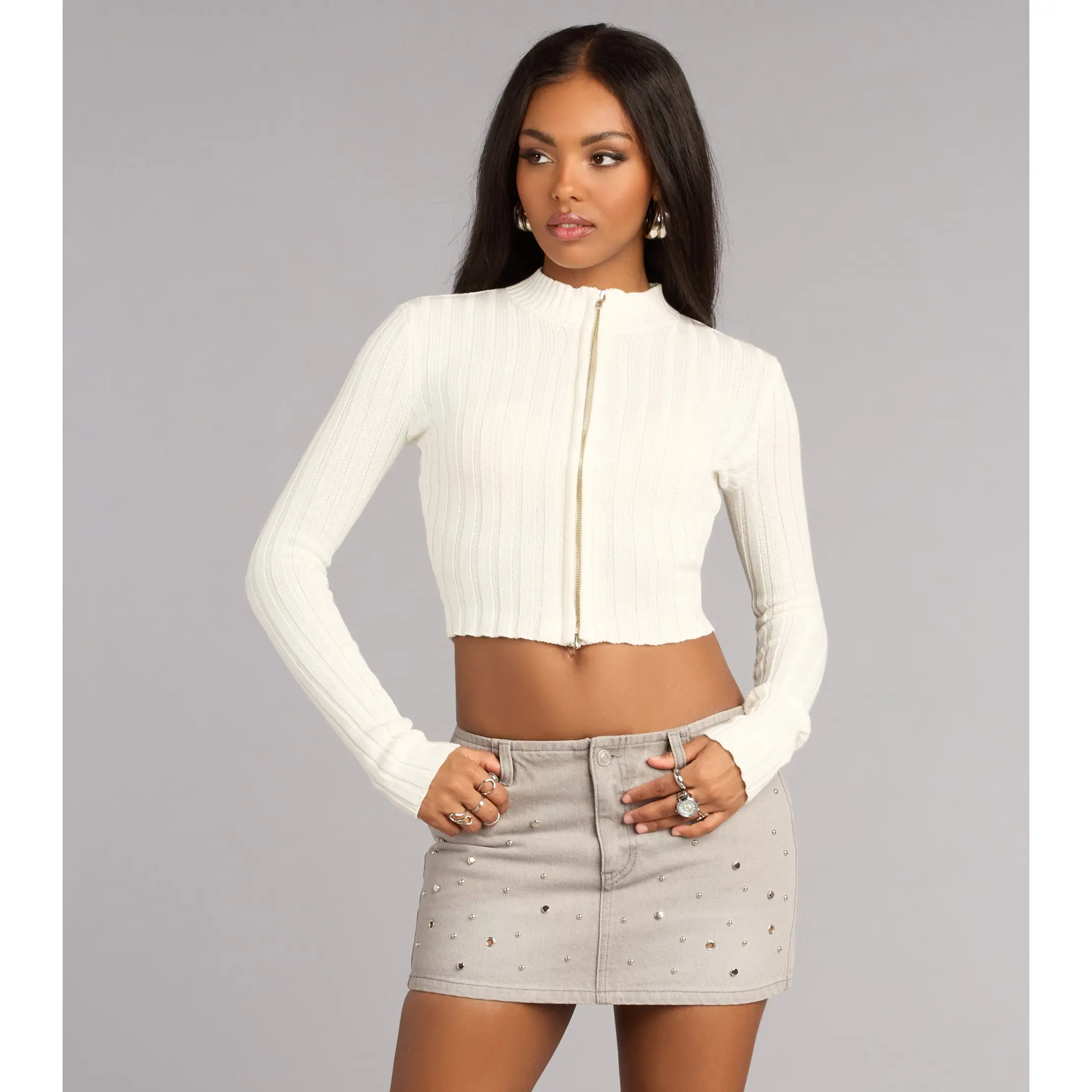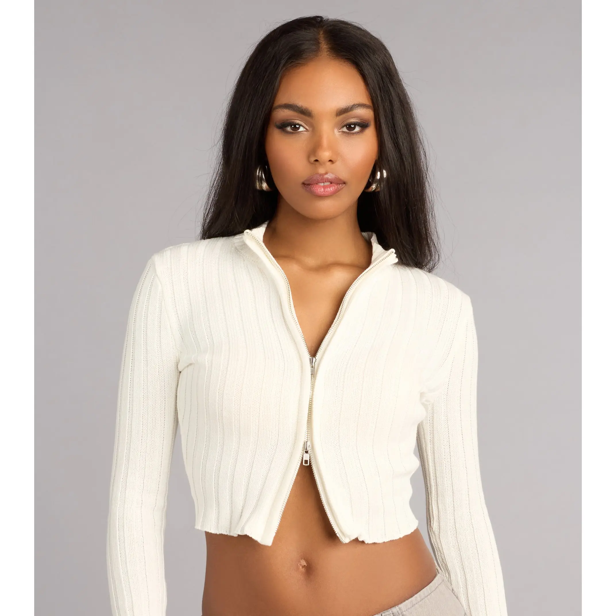 Minimal with just enough attitude. This ribbed cropped sweater features a sleek dual zip front that lets you style it your way—zipped up for polish or slightly open for a cute, everyday vibe.
