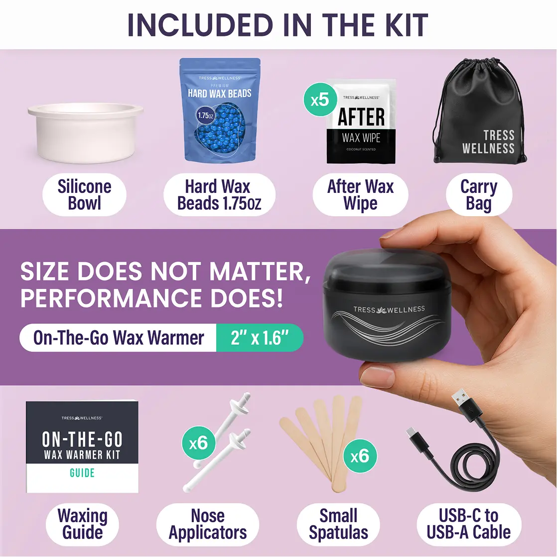 All-in-one kit — Mini USB wax warmer, carry bag, wax beads, silicone bowl, applicators, nose wax sticks, soothing after-wax wipes + guide