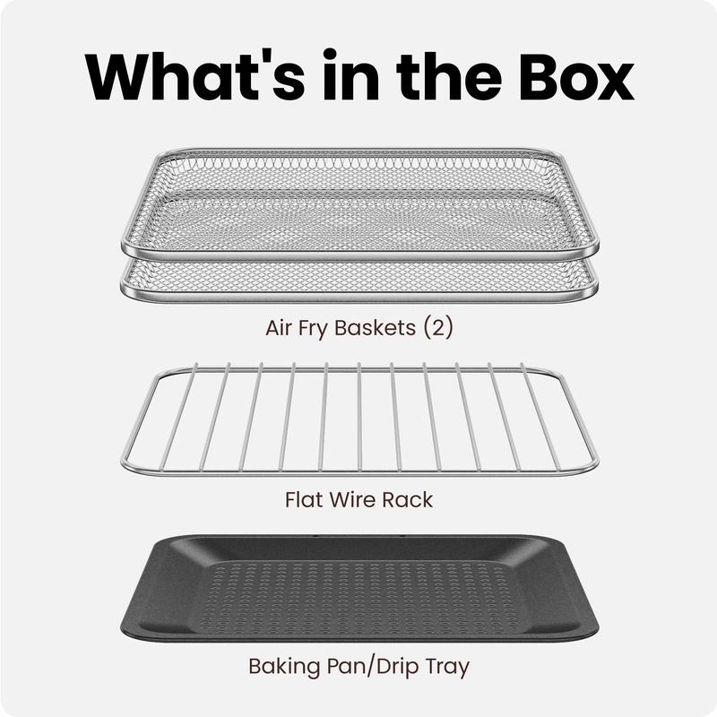 The Chefman EasyAir Oven + Fryer cooks faster than your oven with five functions and a 15-quart capacity. It includes a digital control panel, flip notifications, and dishwasher-safe accessories for easy use and cleanup.