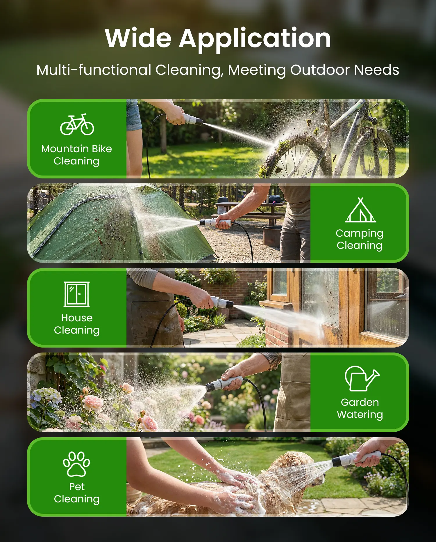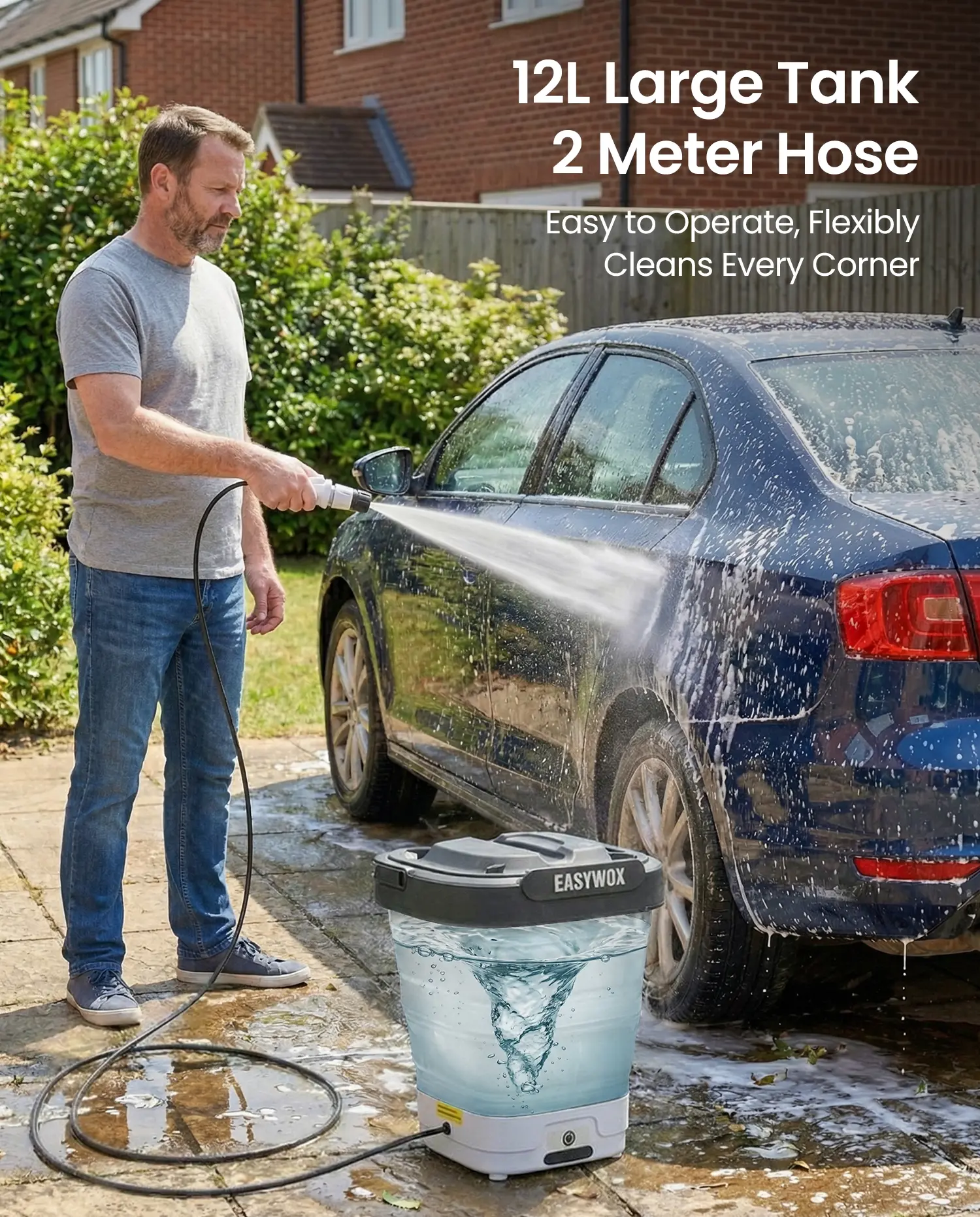The high-capacity 12L tank and 2-meter hose ensure extended cleaning without frequent refills. Perfect for cars, bikes, patios, garden tools, and camping gear. This large capacity makes it an excellent choice for various cleaning needs, ensuring you're always prepared.
