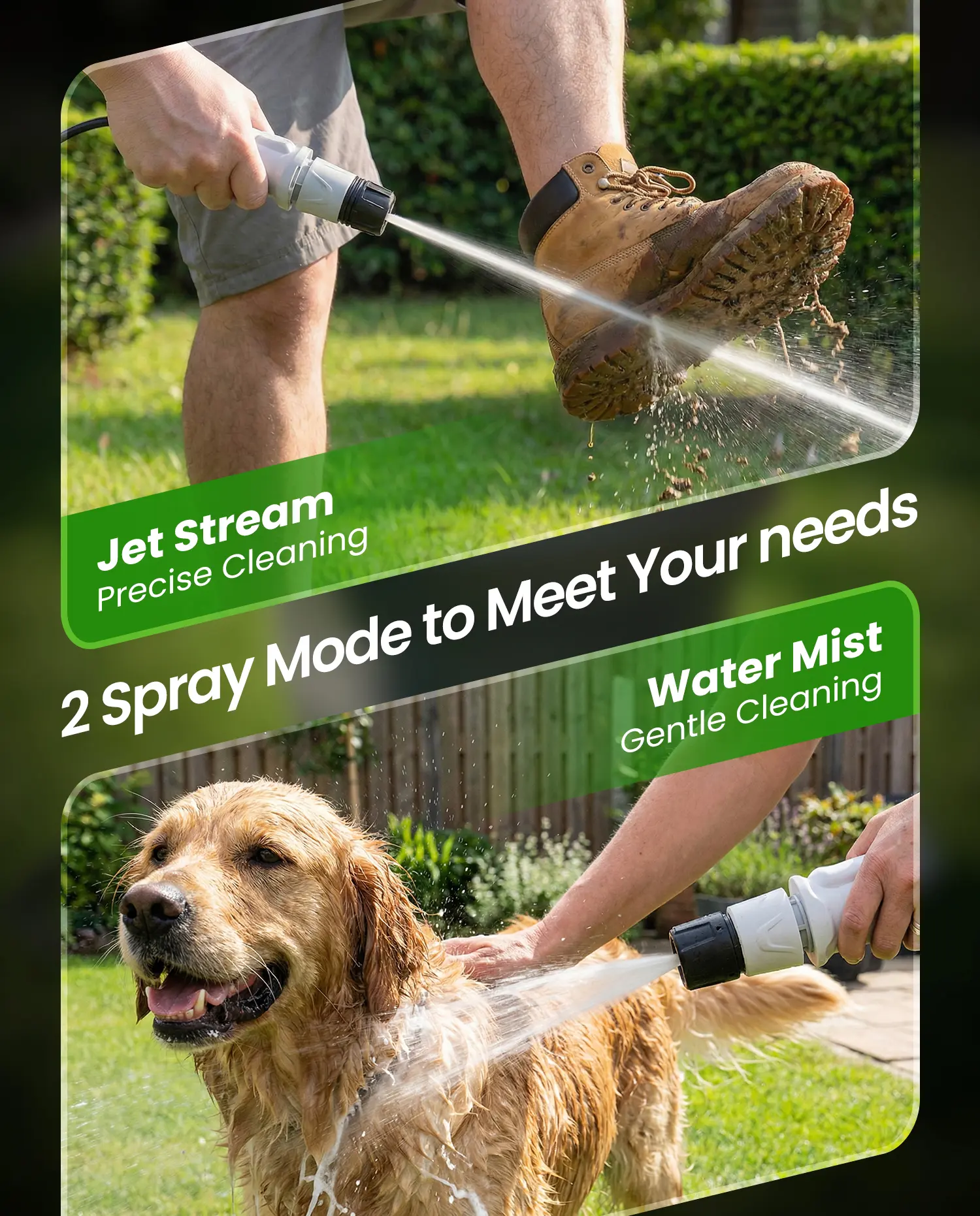 Equipped with two nozzles: a 25° Fan Nozzle for strong jet streams on vehicles, bikes, and driveways; and a Mist Nozzle for gentle sprays on flowers, pets, and delicate surfaces. Choose the right nozzle for your cleaning task.