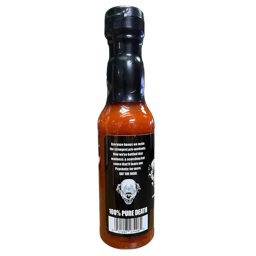 Everyone knows we make the strongest pre-workouts. Now we've bottled that madness: a scorching hot sauce that'll leave you Psychotic for more. EAT THE DEAD Our Psy-racha Hot Sauce is a fiery symphony where classic Sriracha meets the blistering heat of Ghost Chiles!  Intensity: Boasting an unapologetic 5 Killer Clowns on the heat scale, this sauce isn't for the faint-hearted, delivering an extreme heat level that pushes the boundaries of fiery intensity while maintaining the signature psyracha essence.