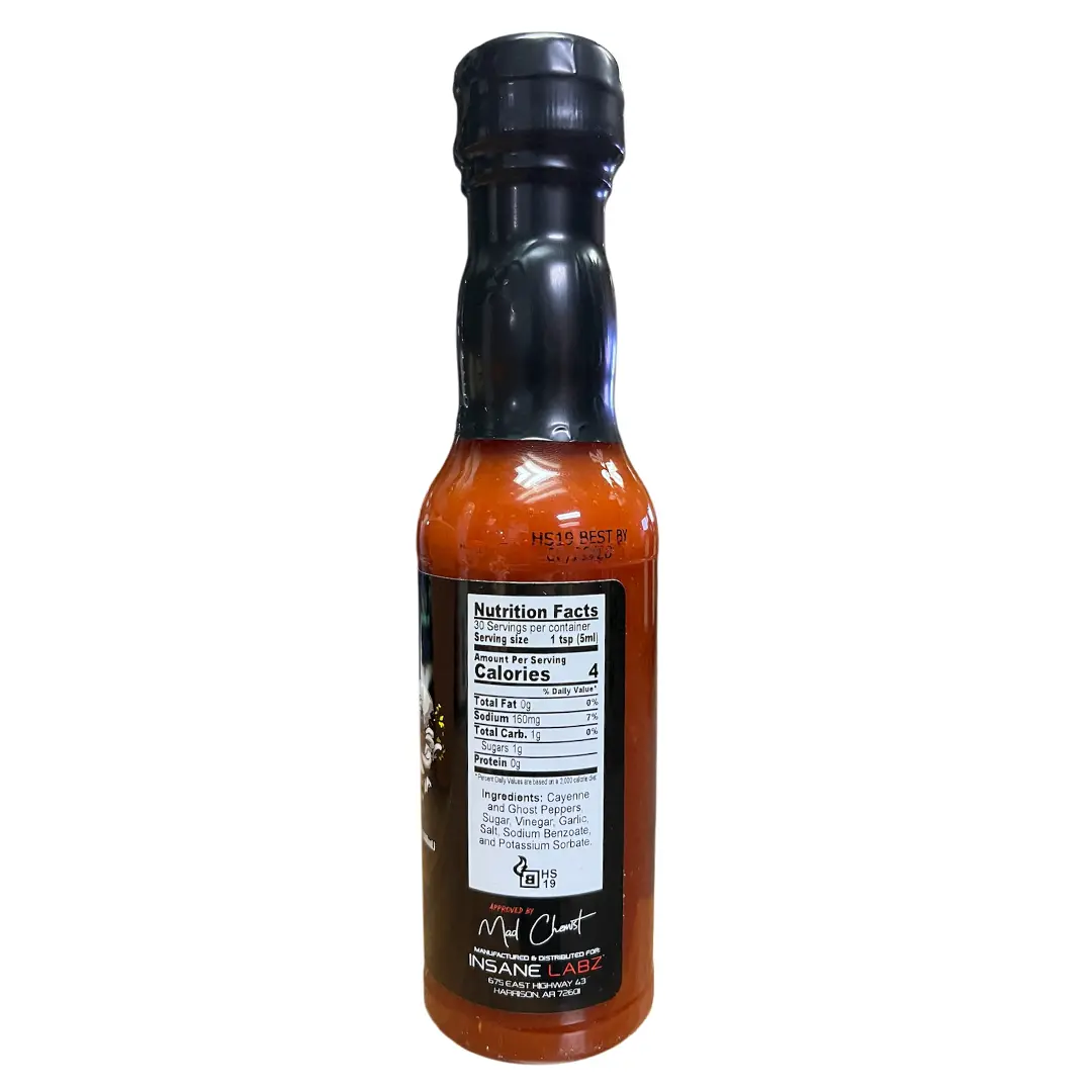 IngredientsCayenne Pepper,Ghost Chile Peppers,Sugar,Vinegar,Garlic,Salt,Sodium Benzoate,Potassium Sorbate