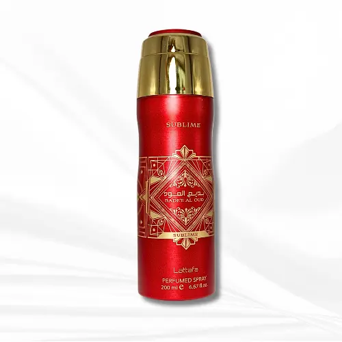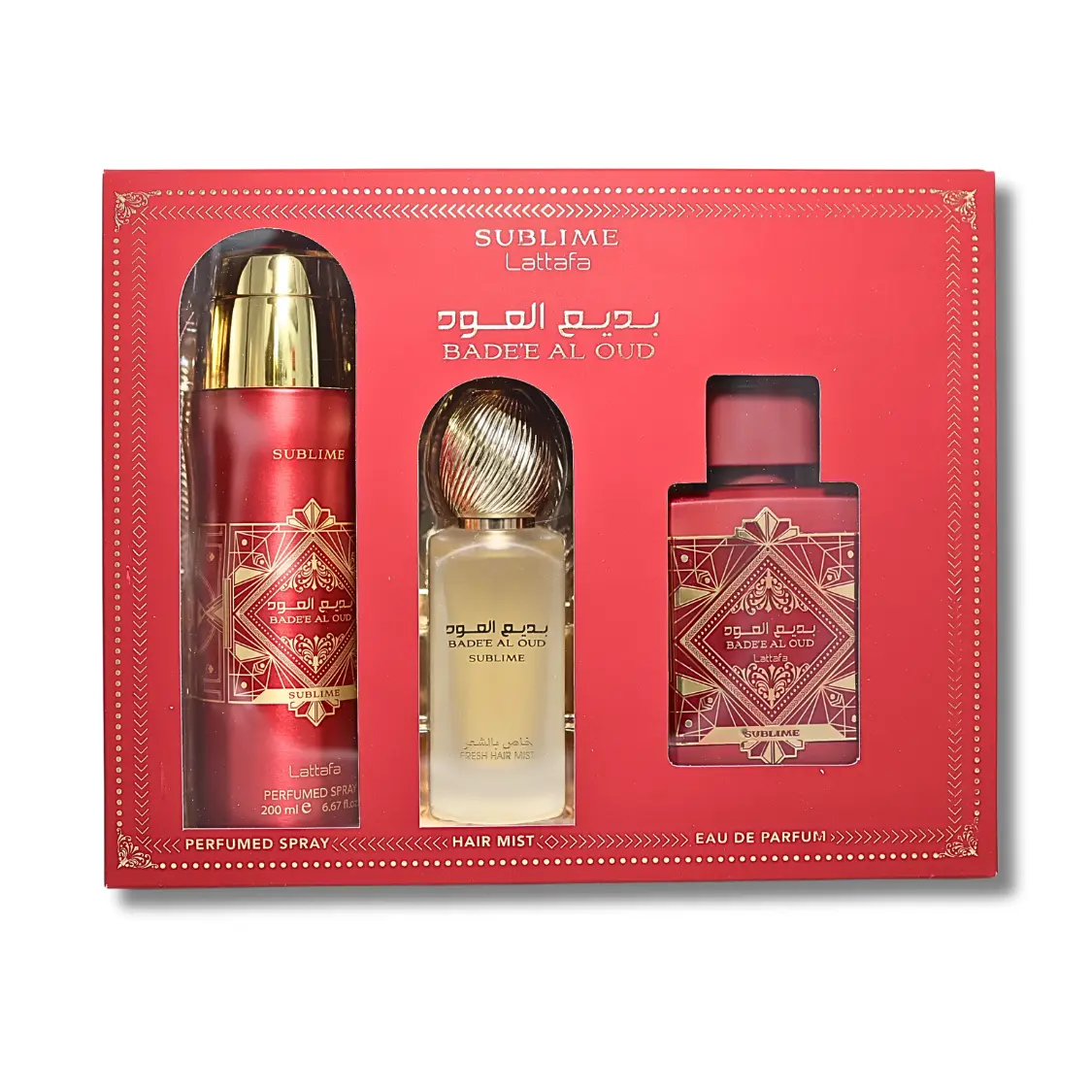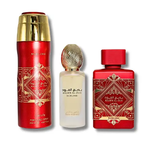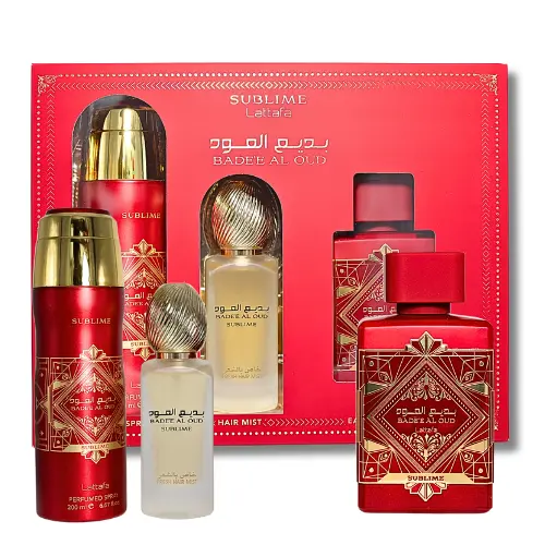 Indulge in the luxurious lattafa badee al oud subline gift set, featuring Eaude parfume spray and hair mist for a complete sensory experience.