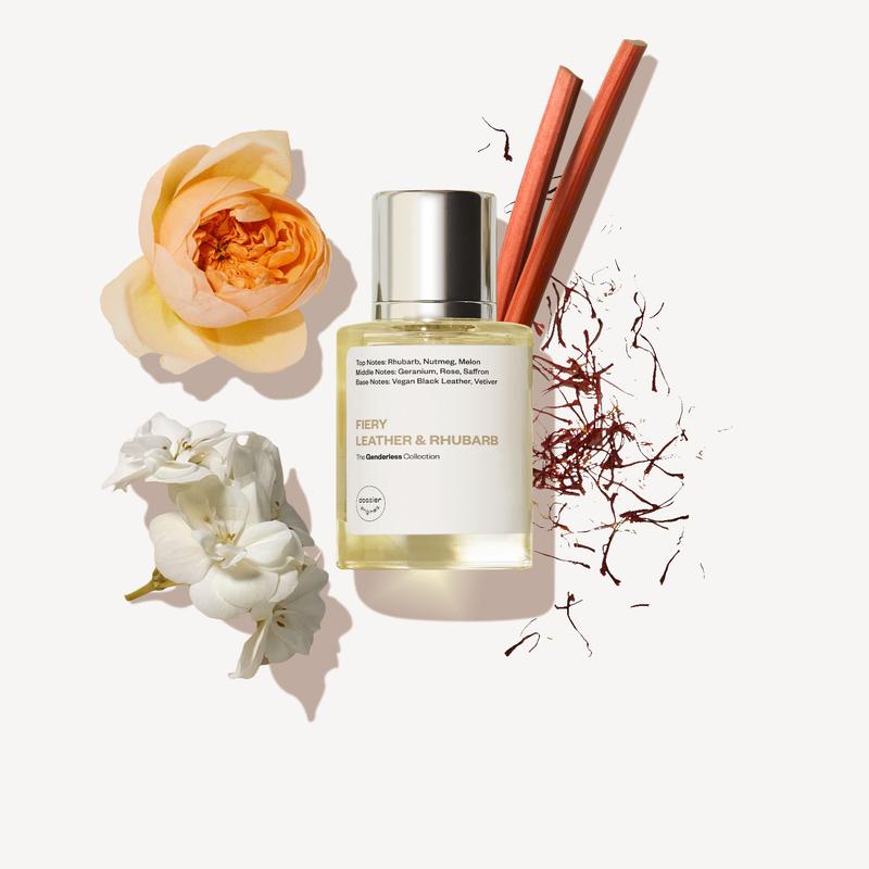 Fiery Leather & Rhubarb is an unconventional medley of raw materials, florals, vegan black leather accord, and rhubarb. This bold scent builds off each ingredient to deliver a balance of masculine leather and feminine florals with vegetal notes of rhubarb.