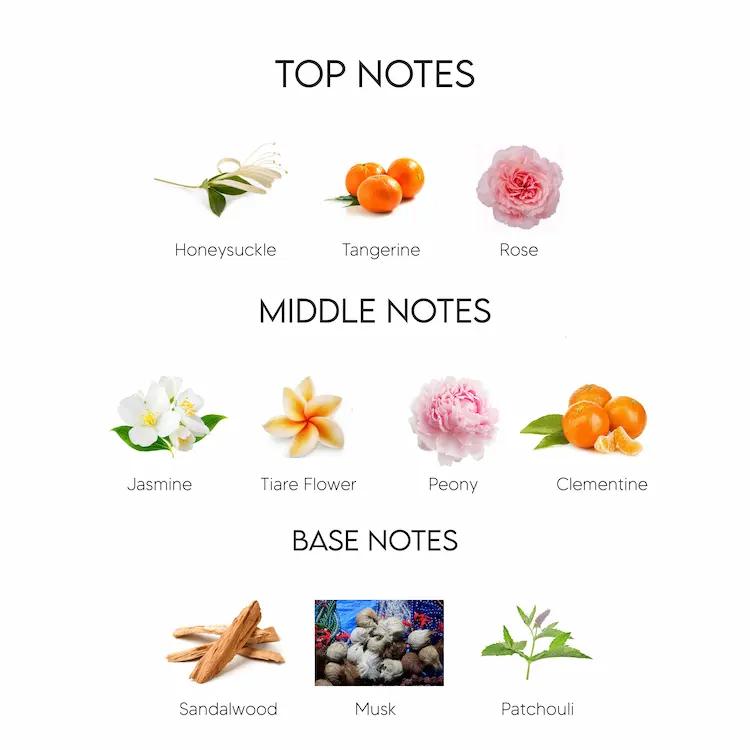 Middle Notes: In the middle, the fragrance reveals an elegant bouquet of jasmine, tiare flower, peony, and clementine. These delicate and exotic floral notes create a lush, feminine experience, filling the air with an irresistible floral essence that’s both sophisticated and alluring.