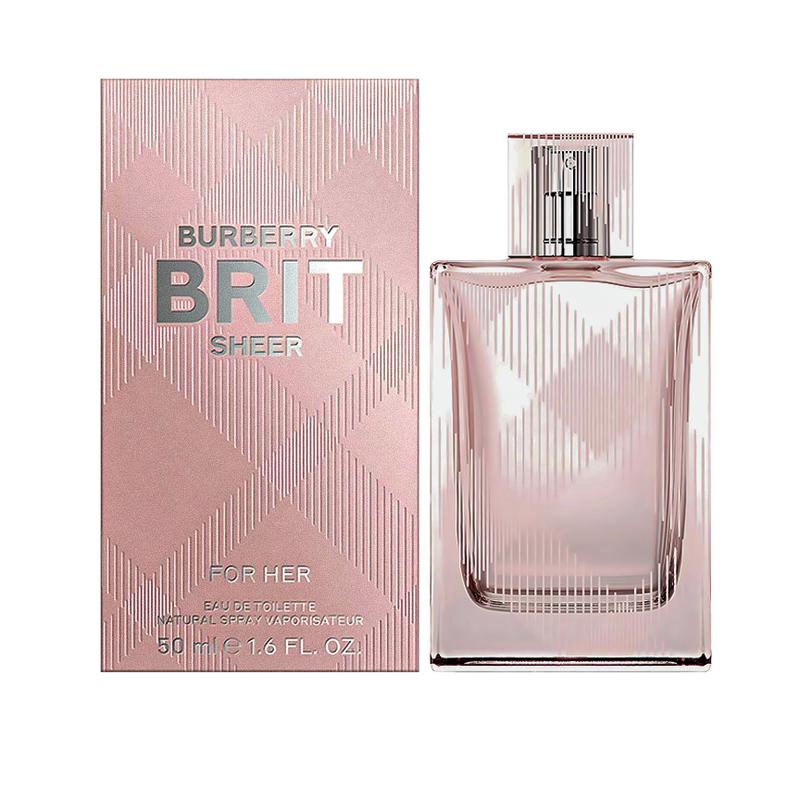 ·Base notes: White Musk, White Woods Burberry Brit Sheer Eau de Toilette for Women – fruity, floral, and soft woody notes in a delicate pink bottle.