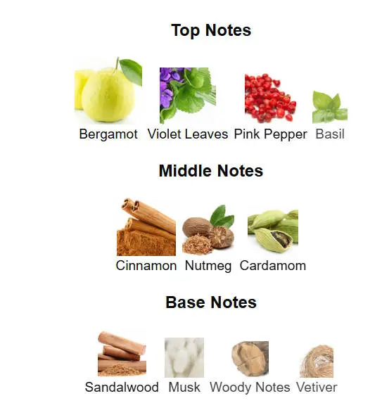 The top notes of orange, basil, violet leaf, and bergamot create an energizing burst of freshness. The heart notes consist of nutmeg, cinnamon, pink pepper and cardamon which add a spicy twist to the scent. The base notes are musk, sandalwood, woodsy notes and vetiver which provide an earthy aroma that lingers on your skin.