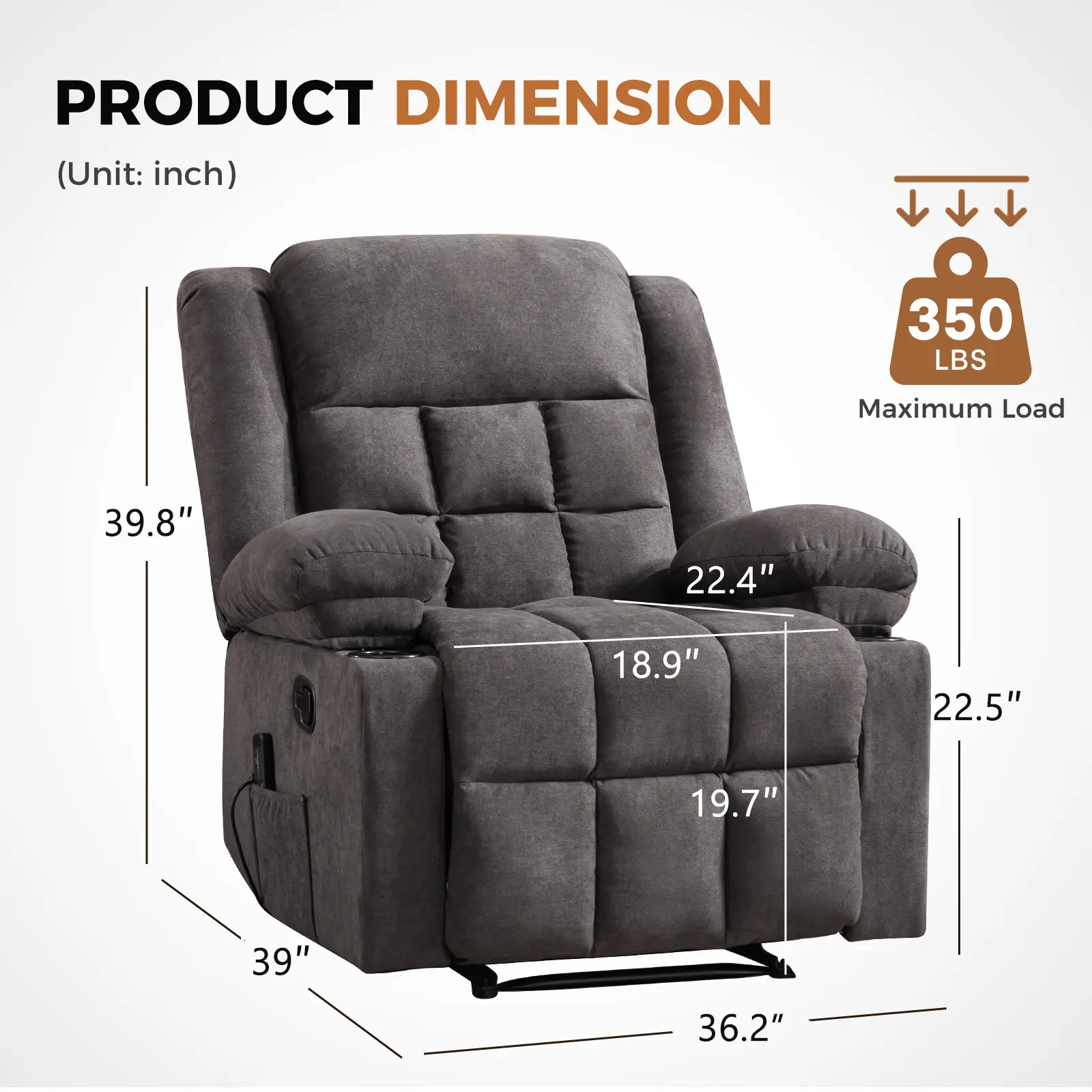 Generous Dimensions: Measures 36.2" W x 39" D x 39.8" H, with a seat of 18.9" W x 22.4" D x 19.7" H, supporting a maximum weight of 350 lbs.