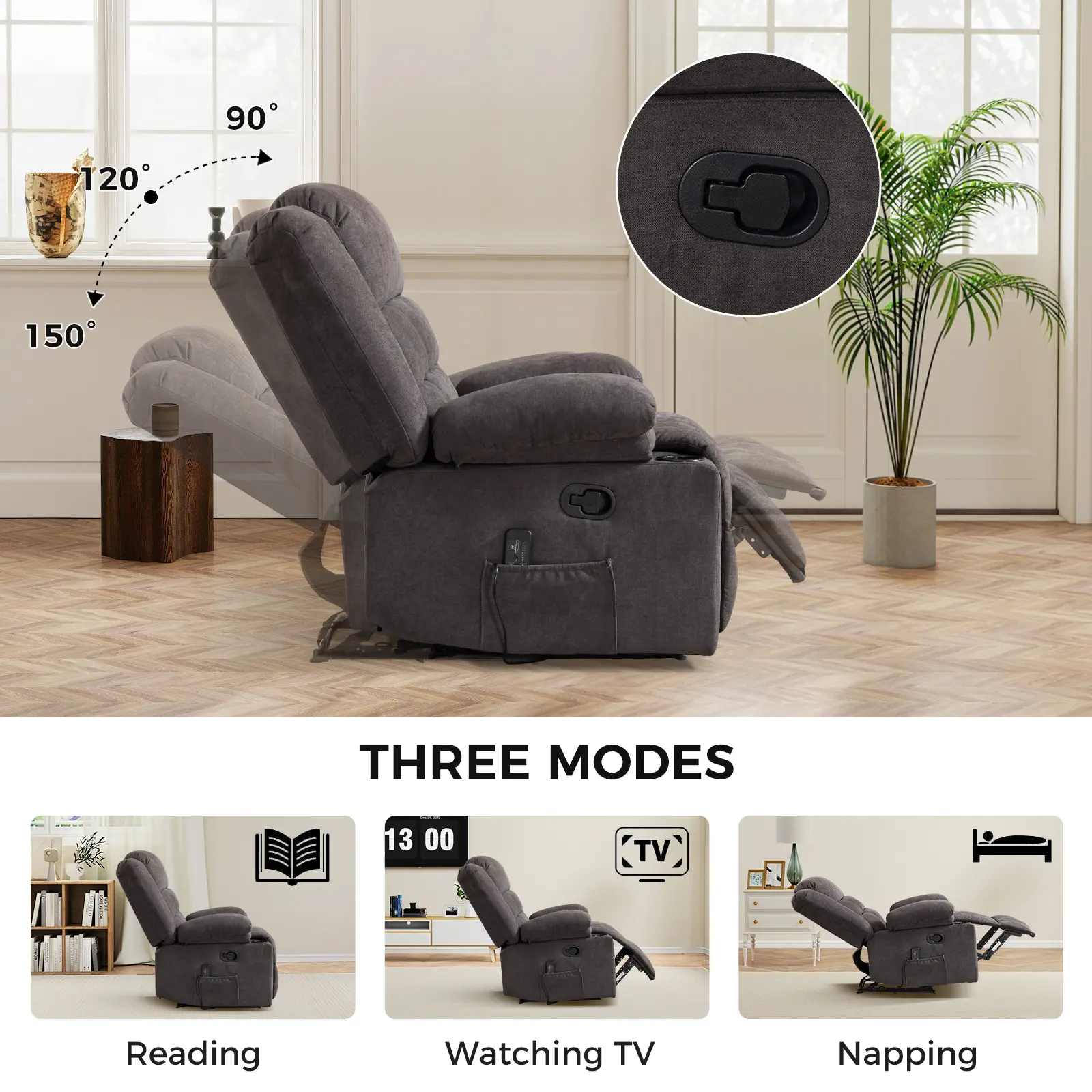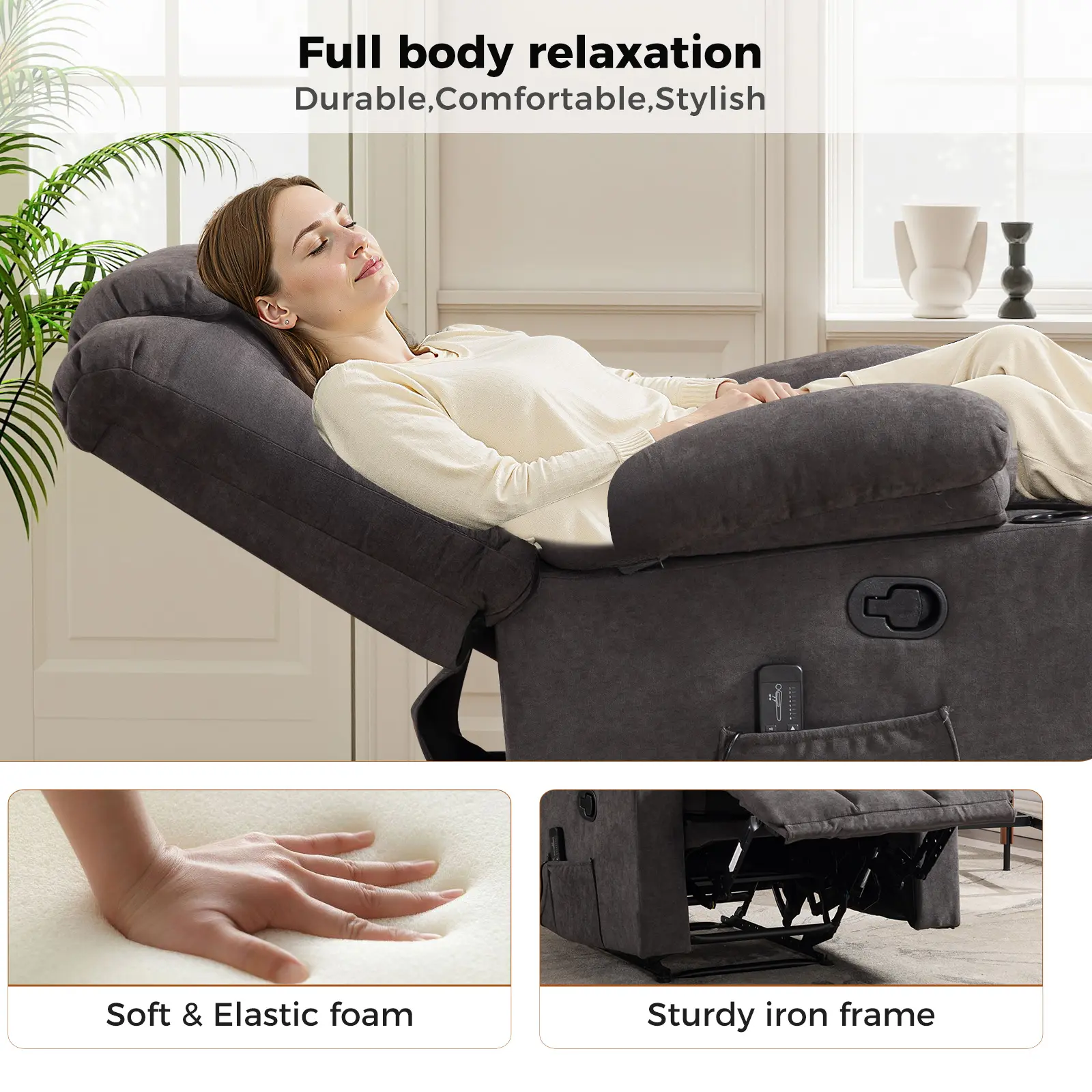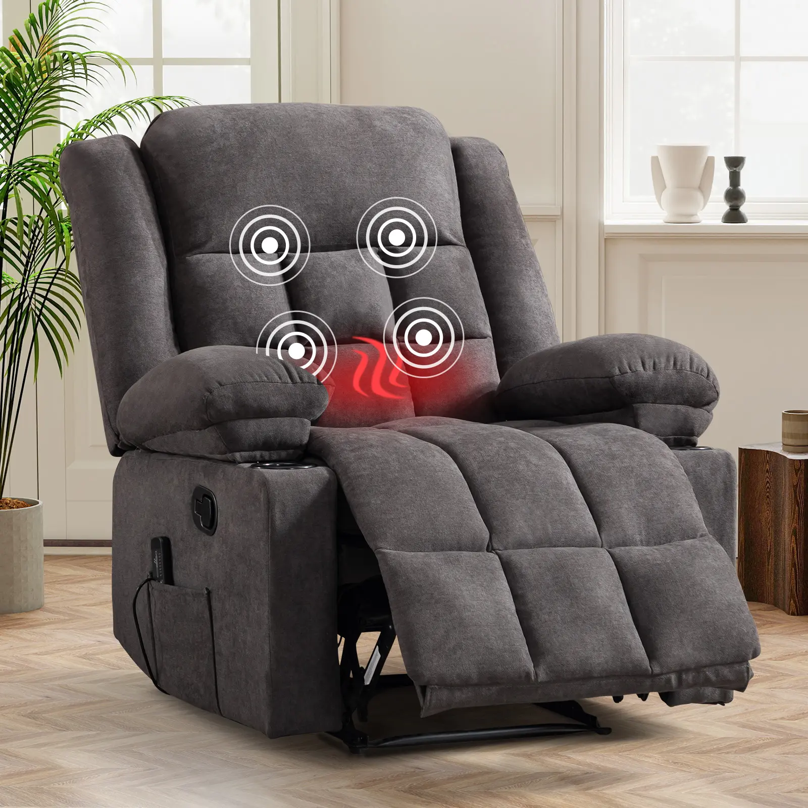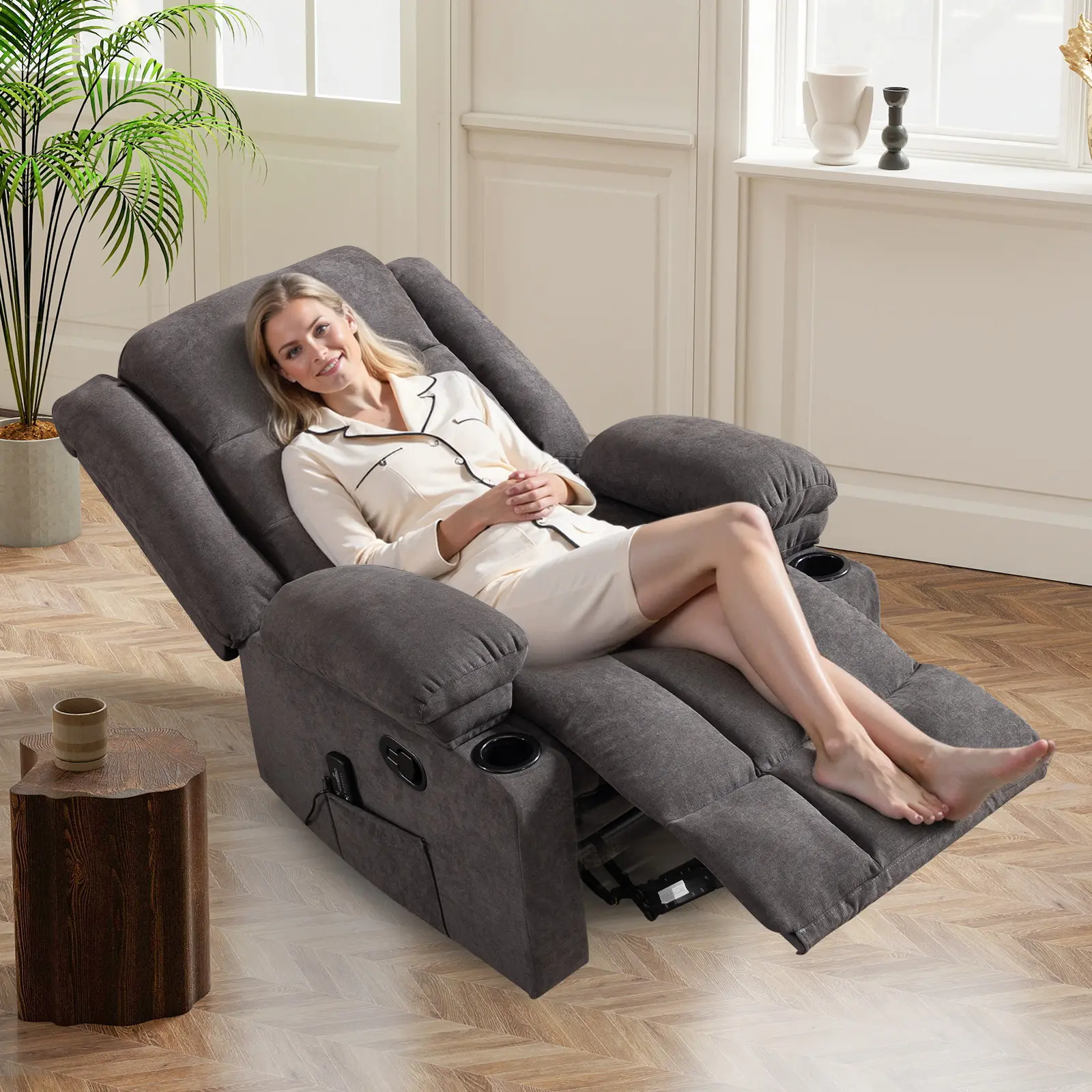 Integrated Conveniences: Features dual cup holders on armrests and side pockets for storing essentials like magazines, remotes, and tablets.