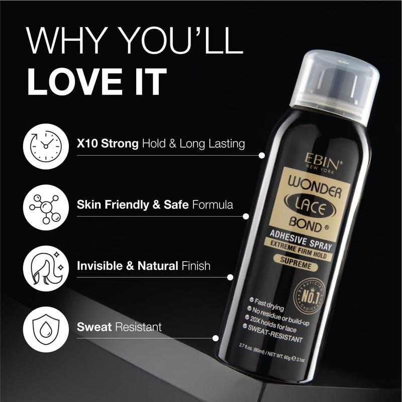 Wonder Lace Bond Adhesive Spray (Full Size)- Fast-drying, sweat-resistant hold- Buildable strength for light to strong bond- Ideal for lace fronts, closures, and edges- No sticky residue with proper removal