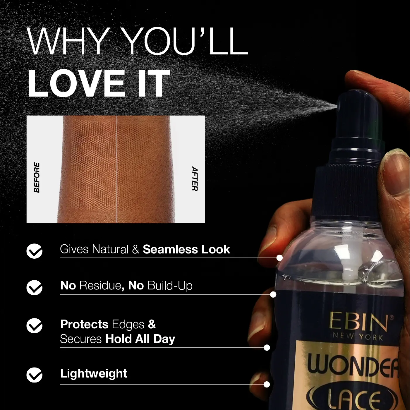 Wonder Lace Bond Melt Spray (Full Size)- Melts lace seamlessly into the skin- Lightweight, natural-looking finish- Perfect for touch-ups and blending- No flaking, no white cast