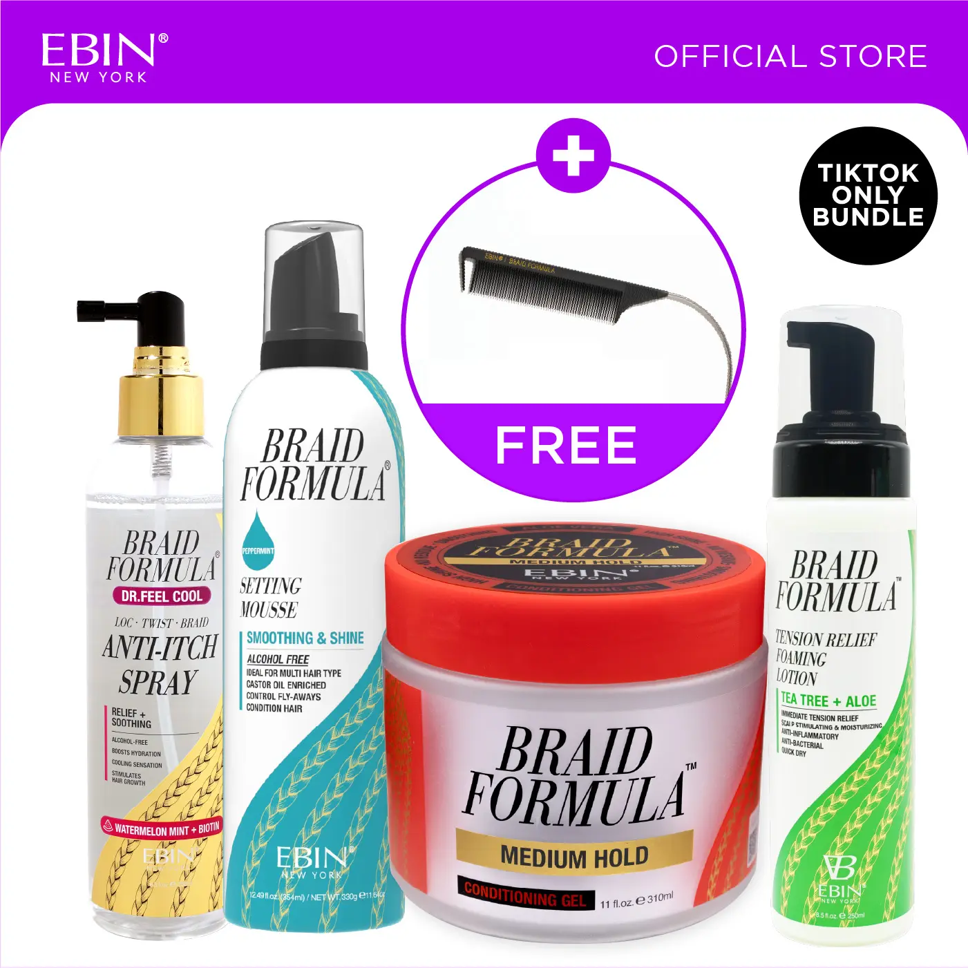 Keep your braids flawless, comfortable, and healthy with this ultimate EBIN Braid Formula Protective Style Bundle! This exclusive set includes Braid Formula Conditioning Gel (Medium Hold), Setting Mousse (Smoothing & Shine - Menthol), Dr. Feel Cool Anti-itch Spray (Watermelon Mint + Biotin), and Tension Relief Foaming Lotion (Tea tree+Aloe), plus a FREE Curved Pintail Carbon Comb. Designed to deliver long-lasting hold, frizz control, moisture, scalp comfort, and shine, this bundle is perfect for achieving polished braids, twists, and locs while keeping your scalp refreshed and healthy.