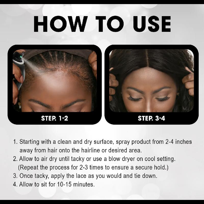 1. Starting with a clean and dry surface, spray Wonder Lace Bond Adhesive Spray 2-4 inches away from hair onto the hairline or desired area.