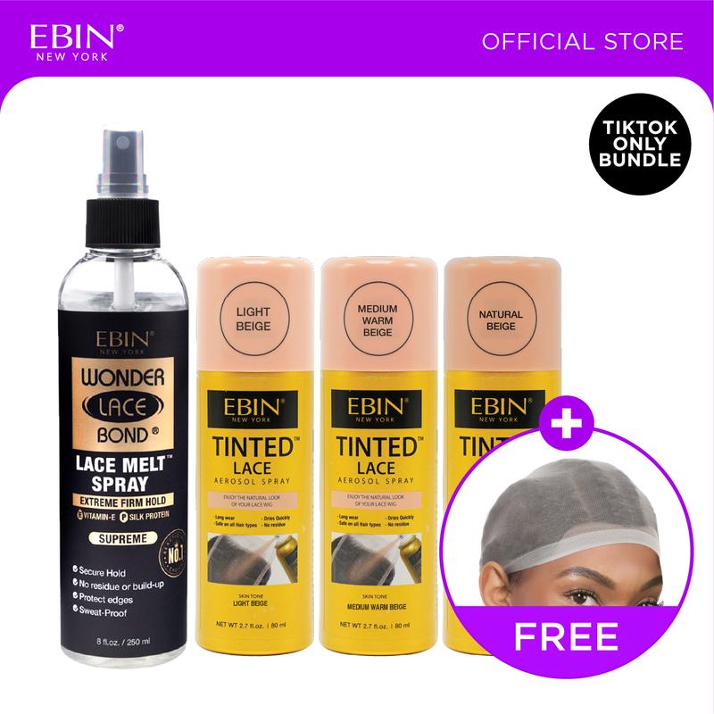 Get a flawless, natural lace finish with the perfect tone match! This exclusive EBIN bundle features our Tinted Lace Spray in three versatile shades (Light Beige, Medium Warm Beige, and Natural Beige) and our Top-selling Melt Spray—plus a FREE Wig Cap to prep and protect your install. Designed to blend lace seamlessly into the skin, this bundle helps create a smooth, undetectable hairline every time. Whether you’re customizing a wig or refreshing your install, this set makes lace melting easier, faster, and more natural-looking. What’s Included EBIN Tinted Lace Spray – Light Beige (2.7oz / 80ml) • Brightens and neutralizes lighter lace • Helps lace blend seamlessly into lighter skin tones • Lightweight, even coverage • No heavy buildup or residue EBIN Tinted Lace Spray – Medium Warm Beige (2.7oz / 80ml) • Warm undertone for a natural lace blend • Ideal for medium to tan skin tones • Enhances realism of lace fronts and closures • Smooth, non-cakey finish EBIN Tinted Lace Spray – Natural Beige (2.7oz / 80ml) • Neutral brown tone for versatile matching • Perfect for deeper or balanced skin tones • Creates a clean, scalp-like appearance • Easy to layer for custom coverage EBIN Wonder Lace Bond Melt Spray (8oz/250ml) • Melts lace seamlessly into the skin • Lightweight, natural-looking finish • Perfect for touch-ups and blending • No flaking, no white cast FREE HD Wig Cap (Transparent) • Helps protect natural hair • Creates a smooth base for installs • Comfortable, breathable fit • Essential prep step for flawless wigs Why You’ll Love It • Three tinted shades for customized lace matching • Creates a natural, scalp-like finish • Lightweight and easy to apply • Enhances lace melt and realism • FREE Wig Cap included for easy prep Perfect For • Lace front wigs & closures • Customizing lace color • Achieving a natural hairline • Wig prep and installs • Beginners and professionals alike