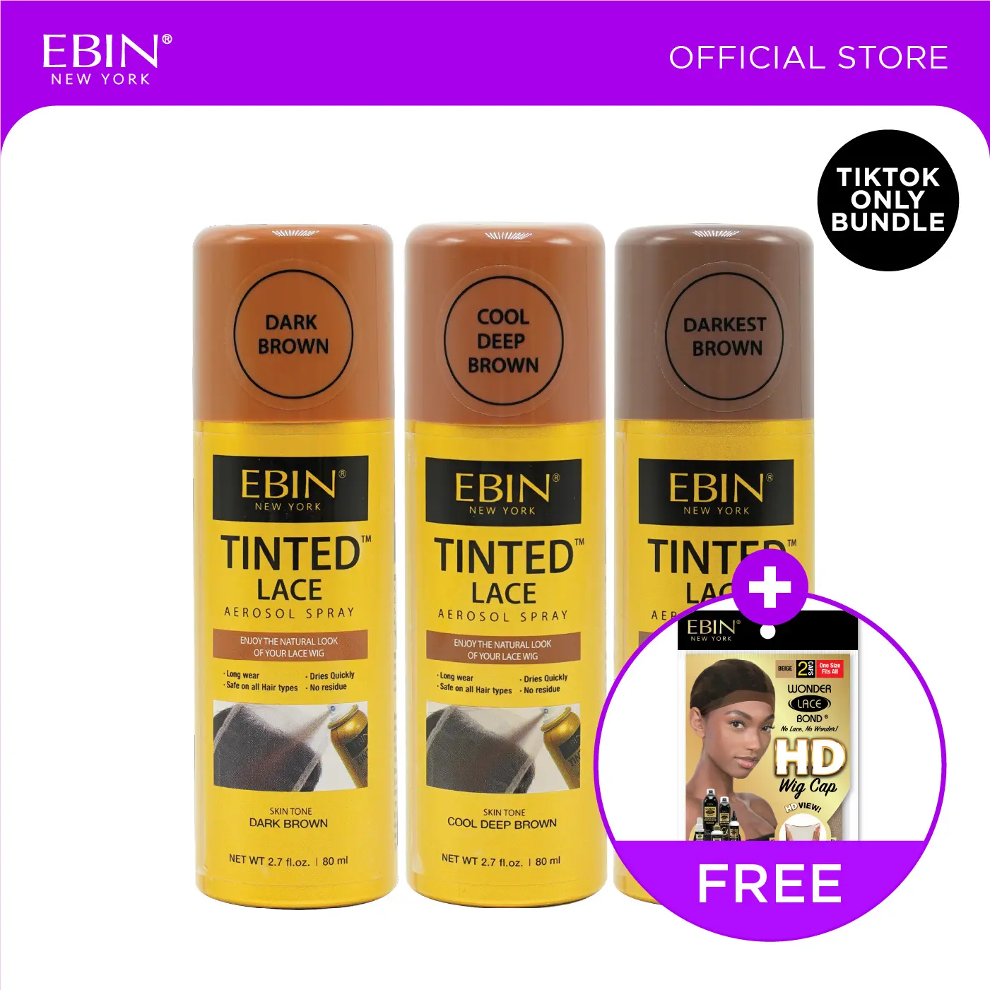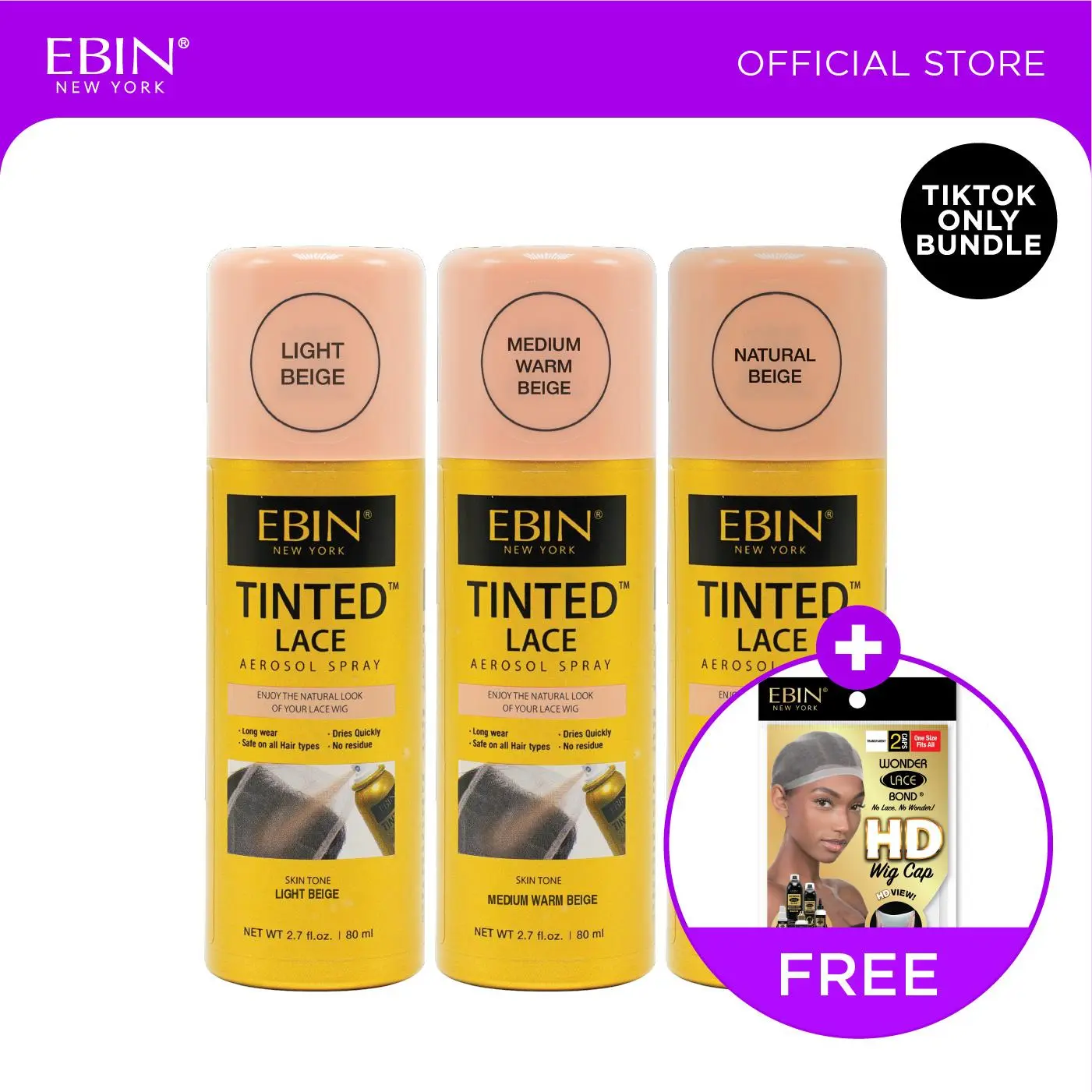 Get a flawless, natural lace finish with the perfect tone match! This exclusive EBIN bundle features our Tinted Lace Spray in three versatile shades—Light Beige, Warm Brown, and Natural Brown—plus a FREE Wig Cap to prep and protect your install. Designed to blend lace seamlessly into the skin, this bundle helps create a smooth, undetectable hairline every time. Whether you’re customizing a wig or refreshing your install, this set makes lace melting easier, faster, and more natural-looking. What’s Included EBIN Tinted Lace Spray – Light Brown Color (2.7oz / 80ml) • Brightens and neutralizes lighter lace • Helps lace blend seamlessly into lighter skin tones • Lightweight, even coverage • No heavy buildup or residue EBIN Tinted Lace Spray – Medium Brown Color (2.7oz / 80ml) • Warm undertone for a natural lace blend • Ideal for medium to tan skin tones • Enhances realism of lace fronts and closures • Smooth, non-cakey finish EBIN Tinted Lace Spray – Dark Bronw Color (2.7oz / 80ml) • Neutral brown tone for versatile matching • Perfect for deeper or balanced skin tones • Creates a clean, scalp-like appearance • Easy to layer for custom coverage FREE Wig Cap • Helps protect natural hair • Creates a smooth base for installs • Comfortable, breathable fit • Essential prep step for flawless wigs Why You’ll Love It • Three tinted shades for customized lace matching • Creates a natural, scalp-like finish • Lightweight and easy to apply • Enhances lace melt and realism • FREE Wig Cap included for easy prep Perfect For • Lace front wigs & closures • Customizing lace color • Achieving a natural hairline • Wig prep and installs • Beginners and professionals alike