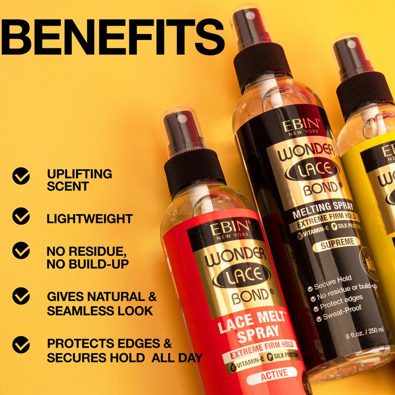 Get a flawless, natural lace finish with the perfect tone match! This exclusive EBIN bundle features our Tinted Lace Spray in three versatile shades (Dark Brown, Cool Deep Brown, Darkest Brown) and our Top-selling Melt Spray—plus a FREE Wig Cap to prep and protect your install. Designed to blend lace seamlessly into the skin, this bundle helps create a smooth, undetectable hairline every time. Whether you’re customizing a wig or refreshing your install, this set makes lace melting easier, faster, and more natural-looking. What’s Included EBIN Tinted Lace Spray – Dark Brown (2.7oz / 80ml) EBIN Tinted Lace Spray – Cool Deep Brown (2.7oz / 80ml) EBIN Tinted Lace Spray – Darkest Brown (2.7oz / 80ml) EBIN Wonder Lace Bond Melt Spray (8oz/250ml) • Melts lace seamlessly into the skin • Lightweight, natural-looking finish • Perfect for touch-ups and blending • No flaking, no white cast FREE HD Wig Cap (Beige) • Helps protect natural hair • Creates a smooth base for installs • Comfortable, breathable fit • Essential prep step for flawless wigs Why You’ll Love It • Three tinted shades for customized lace matching • Creates a natural, scalp-like finish • Lightweight and easy to apply • Enhances lace melt and realism • FREE Wig Cap included for easy prep Perfect For • Lace front wigs & closures • Customizing lace color • Achieving a natural hairline • Wig prep and installs • Beginners and professionals alike