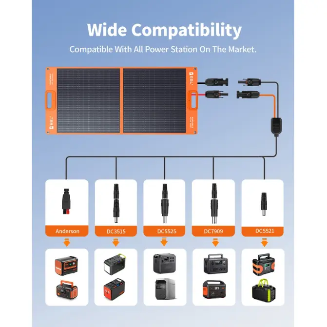 ·EBL Portable Solar Panel compatible with most generators on the market, included some famous brand, additional equipped with multi size connectors, which can match multiple models of computers.