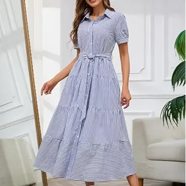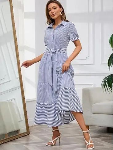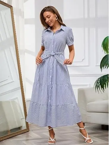 ·STYLISH DESIGN:This 2026 fashion striped button down maxi dress comes with belt, polo collar, short sleeve, high waisted, button closure, slimming fit, the a line silhouette, layered ruffled hemline, contrast color stripes make this long dress cute and flattering. This elegant flowy maxi shirt dress is perfect for the woman who wants to keep charming all the time.