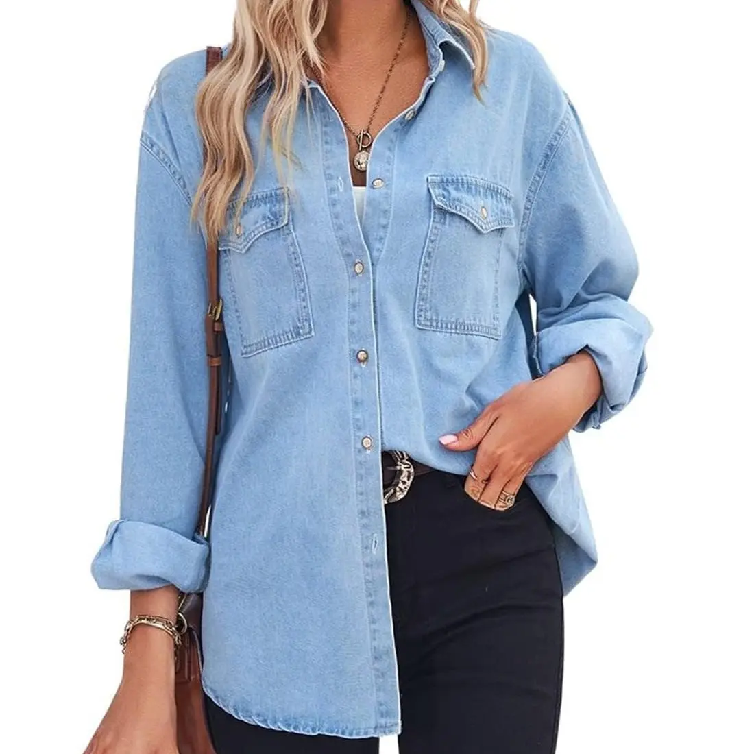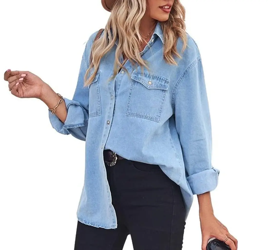·Classic denim shirt for women, featuring 2 classic flap chest pockets at front, front single breasted button up closure, high low hem, spread collar, and long sleeves with button cuffs.